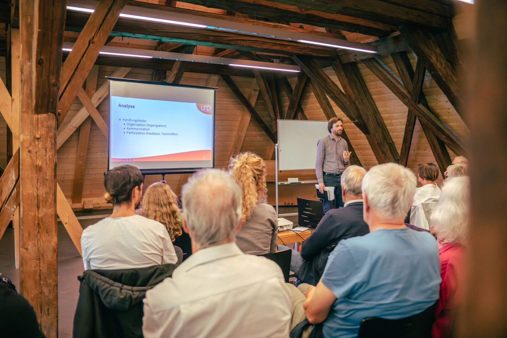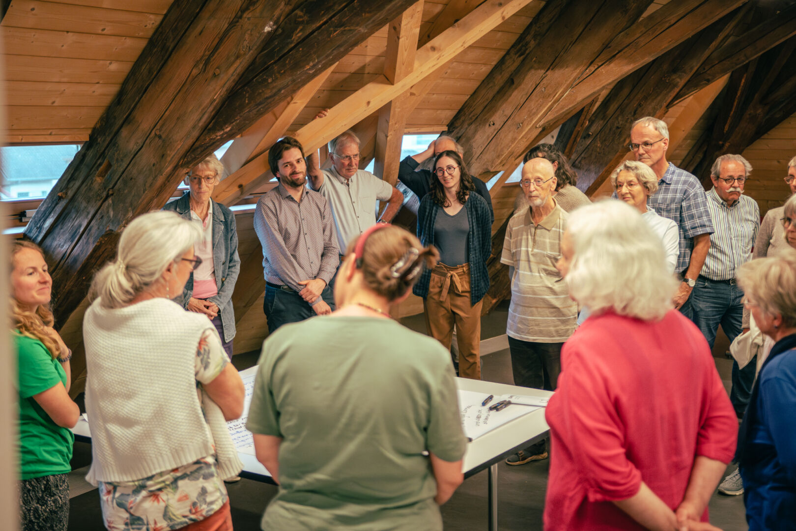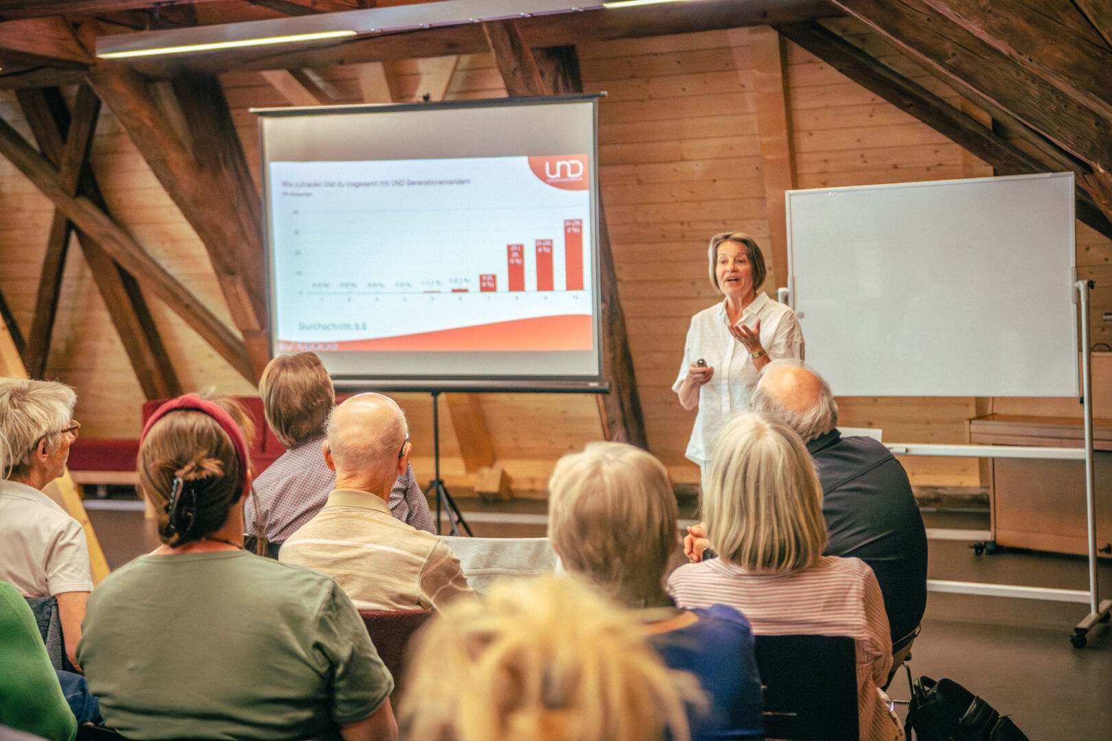 «UND Generationentandem ist fest entschlossen die Freiwilligenkoordination kontinuierlich weiterzuentwickeln», betont Heidi Bühler-Naef (70) bei der Begrüssung zum Freiwilligenanlass «Freiwilligenarbeit bei UND Generationentandem», der am 13. Juni 2024 im Dachstock des Offenen Höchhus stattfand. Finanziell unterstützt wird der Verein dabei seit 2024 von der Beisheim Stiftung. Die Veranstaltung «Freiwilligenarbeit bei UND Generationentandem» diente der Auswertung der Freiwilligenumfrage, die UND Generationentandem einige Monate zuvor lanciert hat, mit dem Ziel herauszufinden, in welchen Bereichen Verbesserungsbedarf besteht.