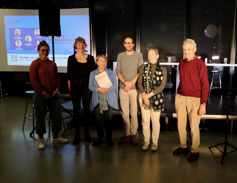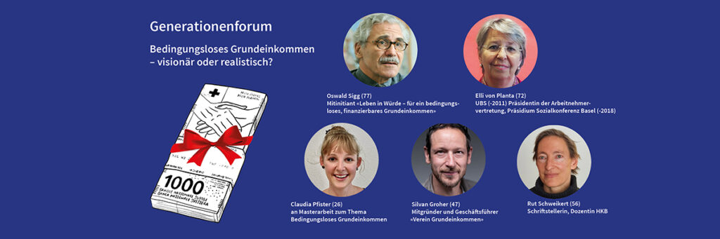 Ein bedingungsloses Grundeinkommen – eine revolutionäre Idee. Ist sie heute umsetzbar oder doch nur der Traum einer Utopie? Dieses Generationenforum (Workshop und Podium) stand ganz im Zeichen der zweiten Grundeinkommens-Initiative, die ein würdevolles Leben für alle fordert. Moderatorin Tabea Kellerist der Initiative mit Oswald Sigg, Claudia Pfister, Elli von Planta, Silvan Groher und Ruth Schweikert auf den Grund gegangen.