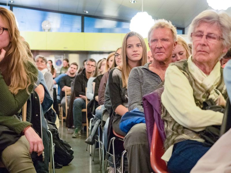 «Bronislaw Erlich, werden Sie nicht müde, Ihre Geschichte immer wieder zu erzählen?» – «Nein. Für die Leute, die zuhören, ist es jedes Mal etwas Neues.» Am Montagabend, 30. April, erzählte Bronislaw Erlich, heute 95-Jahre alt, seine Geschichte einmal mehr, in der Cafeteria des Gymnasiums Thun, Standort Schadau. UND Generationentandem hat für viele Menschen die Gelegenheit geschaffen, einen Holocaust-Überlebenden live zu erleben. Rund 300 BesucherInnen, so schätzen die Organisatoren vom Verein UND Generationentandem, haben den Weg zur Veranstaltung gefunden. Die Cafeteria platzte aus allen Nähten.