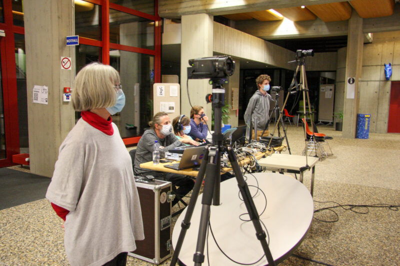 Das Politpodium vom 3. November 2021 zum Covid-19-Gesetz wird durch Lara Thurnherr eröffnet. Auf dem Podium sind ein Gesundheitsexperte, zwei Personen aus dem Ja-Lager und eine Person aus dem Nein-Lager. Die Gegnerin Viola Rossi von der Bewegung «MASS-VOLL» wird per Video zugeschaltet.