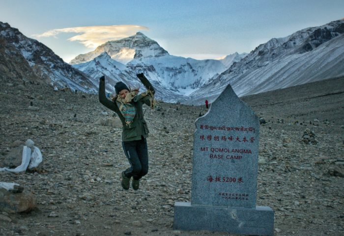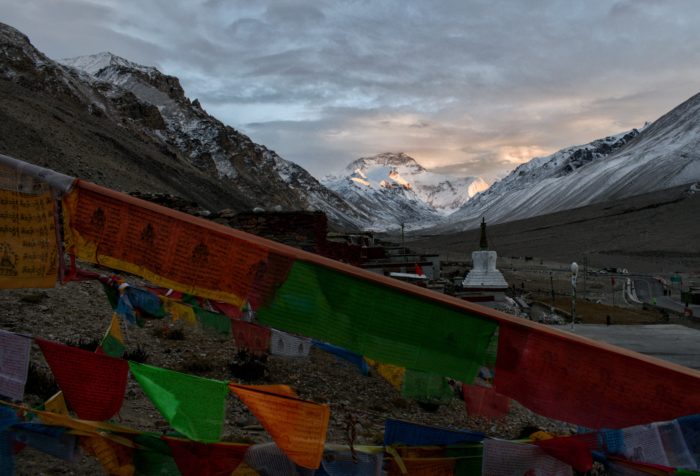 Der Blick auf den Everest, oder den Qomolangma, wie ihn die Tibeter nennen, ist atemberaubend. Der Sonnenuntergang ist trotz der Wolken wunderschön.