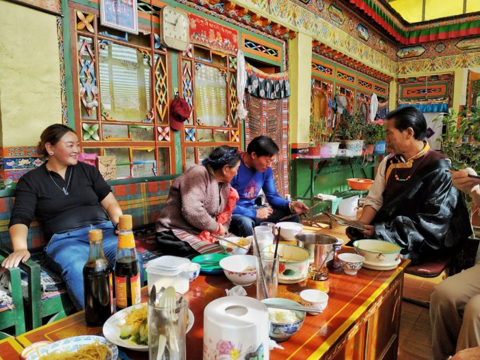 Die Zimmer sind nicht beheizt und beim Benützen der Stehtoilette bläst einem von unten ein eisiger Wind um den Po. Die Toilette besteht nämlich aus einem Loch im Boden des Hauses und man sieht– wenn man hinsehen will– ein paar Meter unter sich das Geröll.