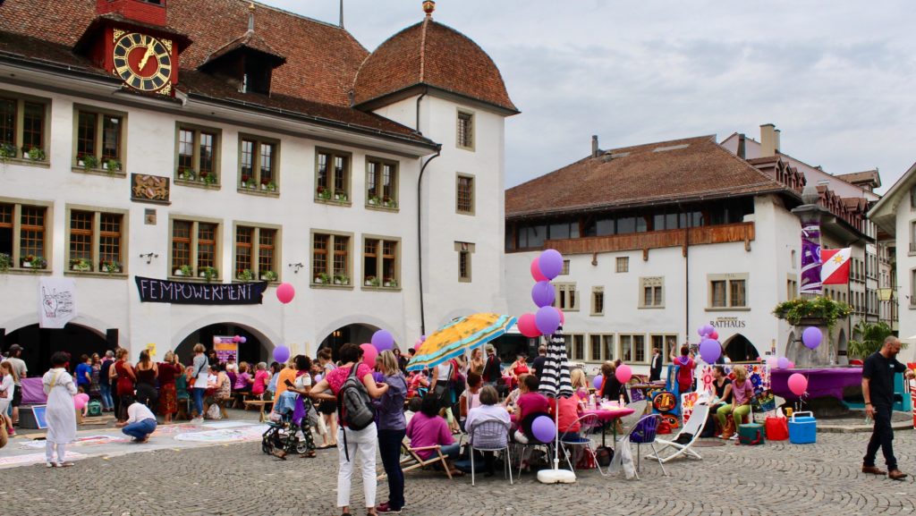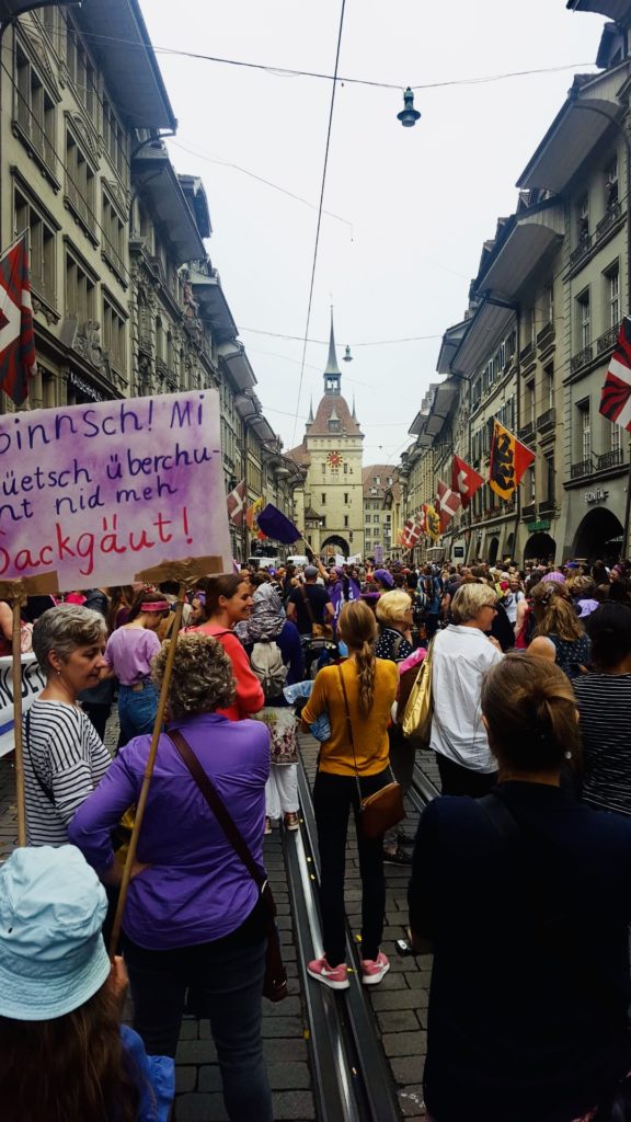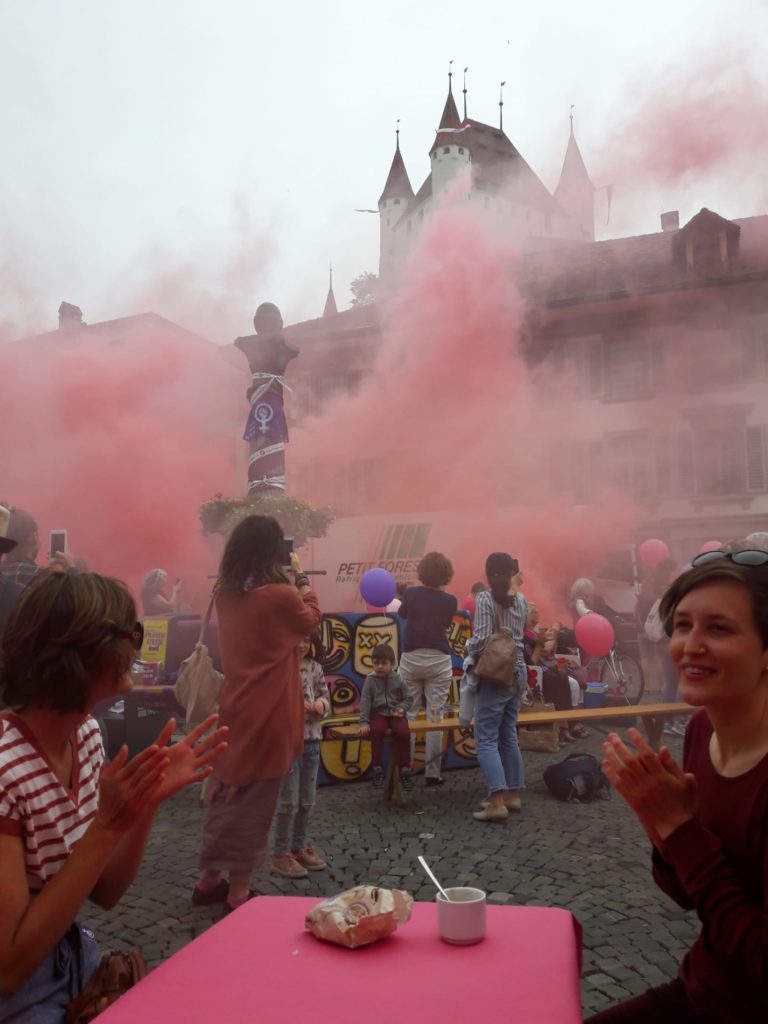 Hochstimmung schon am Morgen des historischen 14. Juni 2019. Etwa in Thun, wo zahlreiche Menschen gekommen sind, um für die Umsetzung der gesetzlich verankerten Gleichstellung einzustehen. Die Parole lautete: Lohn, Zeit, Respekt!