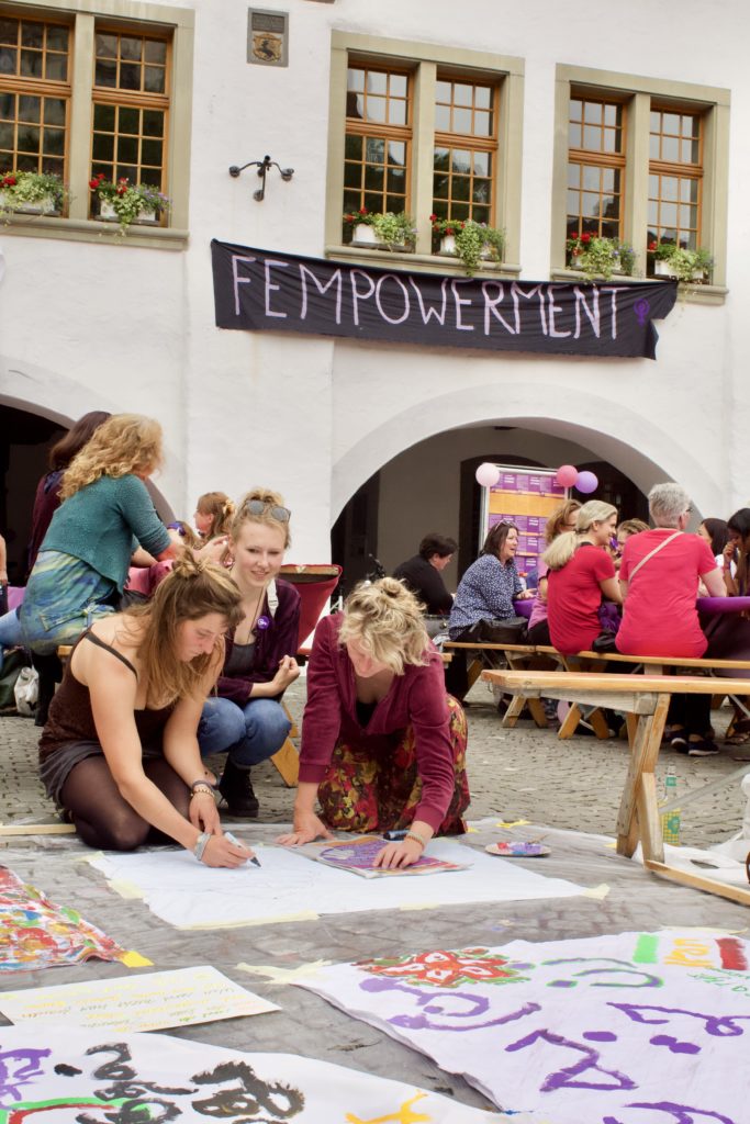 Männer boten im Alternativen Kulturzentrum Thun (Akut) einen Kinderhütedienst an. – Bild: Pamela SteinhauserBild: Mara LudwigGemeinsam Transparente malen: Kreativer Frauenstreik. – Bild: Annina ReusserEin fröhliches Fest in Thun. – Bild: Mara LudwigAuf der Grossen Schanze in Bern am Mittag des 14. Juni 2019. – Bild: Annina ReusserIn der Berner Altstadt. – Bild: Béatrice ZimmermannIn Bern bebte der Bundesplatz: 40’000 Menschen waren allein in der Hauptstadt dabei. – Bild: Mara LudwigDie Forderungen prangen auf kreativen Transparenten. – Bild: Mara LudwigBild: Mara LudwigBild: Mara LudwigBild: Mara LudwigBild: Mara LudwigBild: Mara LudwigBild: Mara LudwigBild: Mara LudwigBild: Mara LudwigBild: Annina Reusser