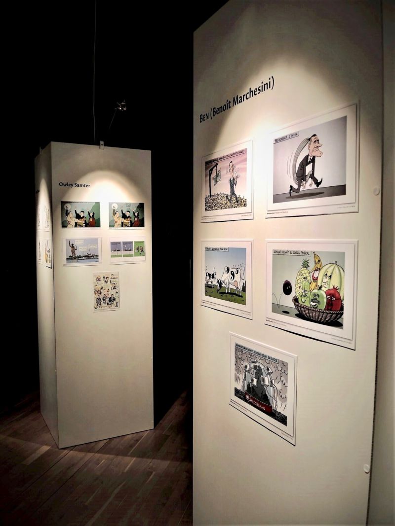 Im ersten Stock des Museums für Kommunikation in Bern stehen Säulen, die auf vier Seiten je einem Autor gewidmet sind, von dem sie höchstens fünf Werke zeigen. Die BesucherInnen zirkulieren bequem um diese Säulen; zudem können sie sich einige Film-Interviews mit AutorInnen ansehen. Mit einer Publikums-Befragung soll der «beste» Cartoon 2017 ermittelt werden.