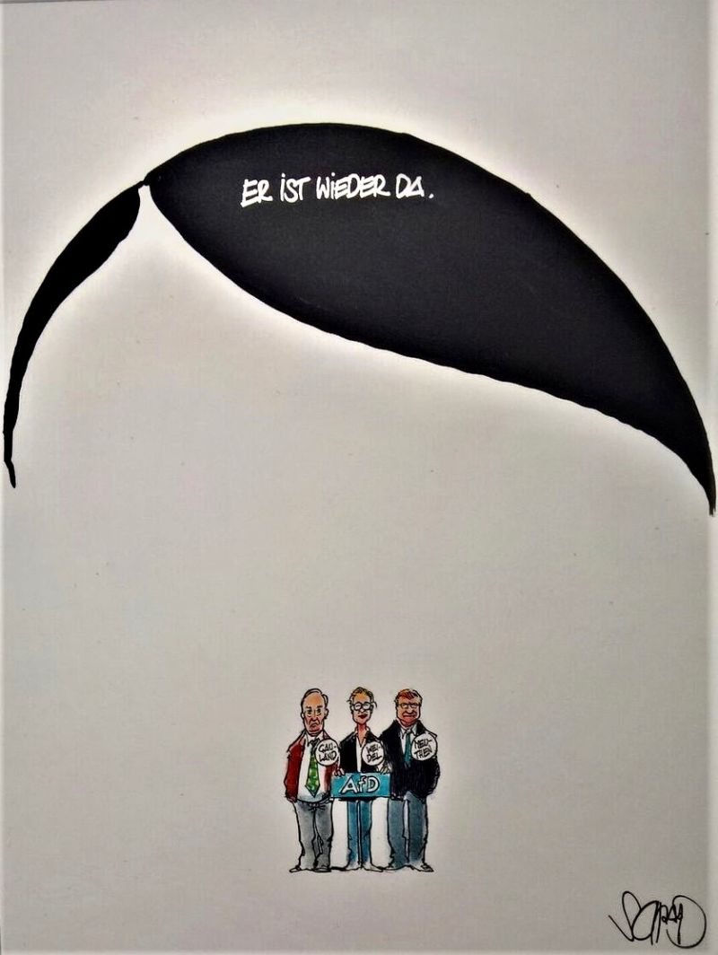 Ein wichtiger Aspekt, der die Ausstellung frisch und unterhaltsam erscheinen lässt, ist die ganz unterschiedliche Gestaltung und Form der Bilder. Da bleibt zum Beispiel fast das ganze Papier weiss, während die Frisur von Hitler mit der Inschrift «Er ist wieder da» und drei deutsche AfD-Politiker als Schnurrbart die einzigen Elemente darstellen (Felix Schaad).