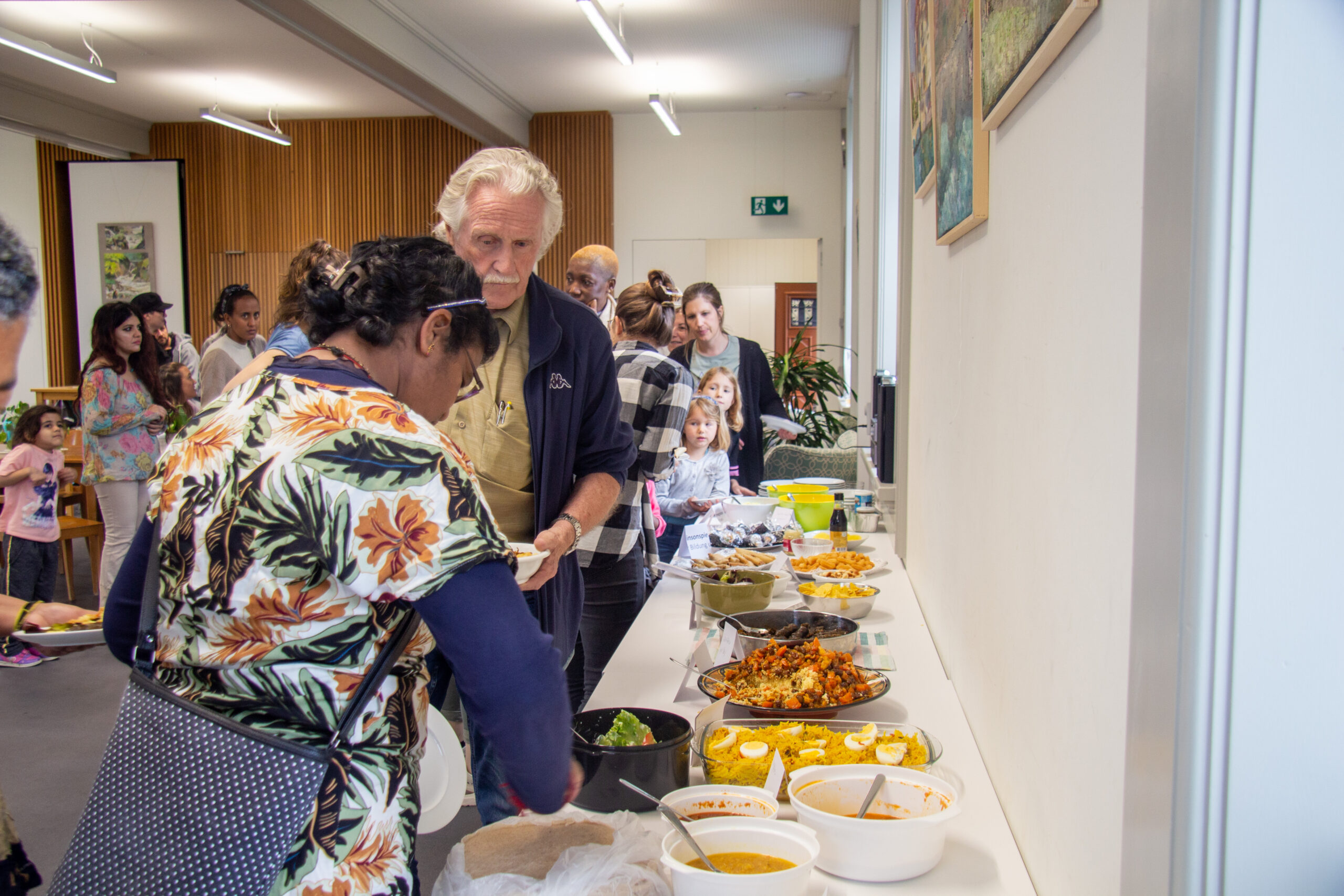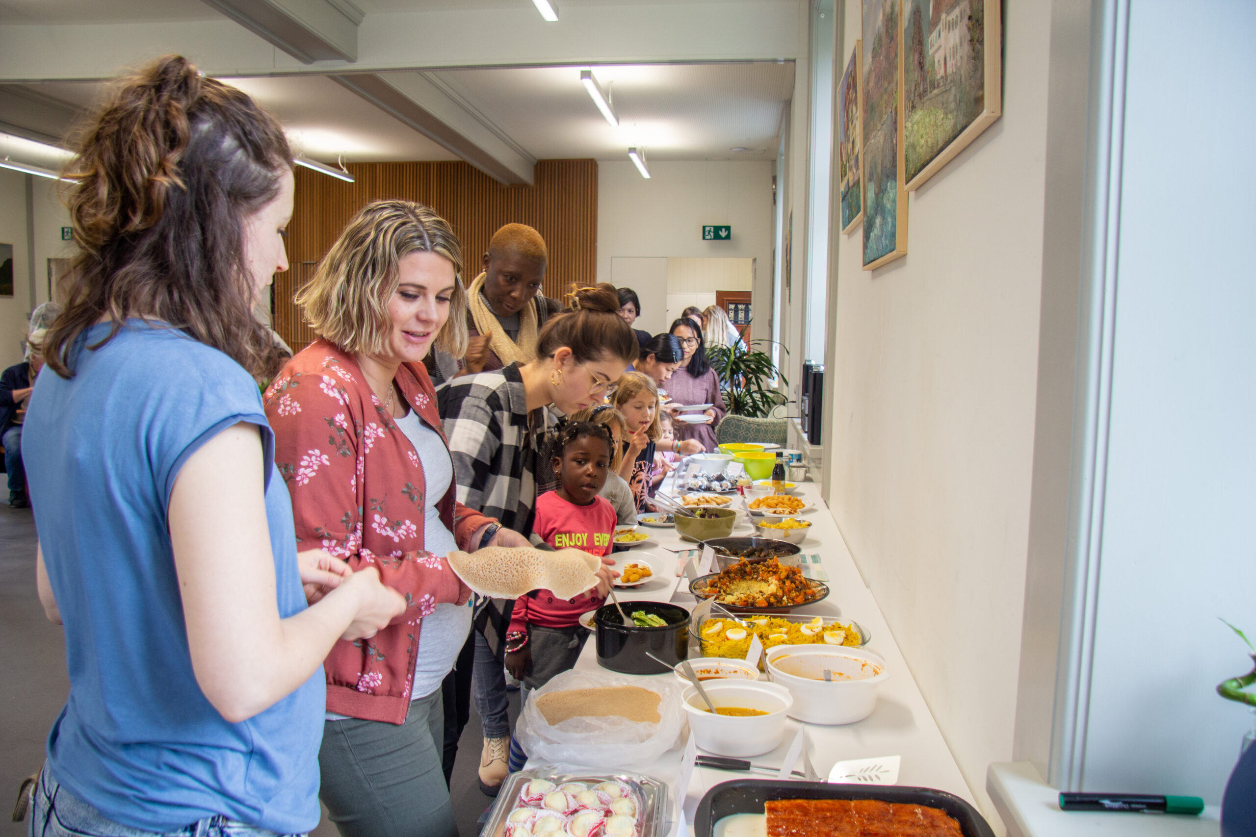 «Wir haben Essen aus aller Welt, aber natürlich nicht aus der ganzen Welt»: Damit eröffnet Annina Fröhlich, Leiterin des Kompetenzzentrum Integration Thun-Oberland (KIO) am Tag der Nachbarschaft das vielseitige und verführerische Buffet – die Speisen wurden von verschiedenen KIO-Besucher:innen mitgebracht.