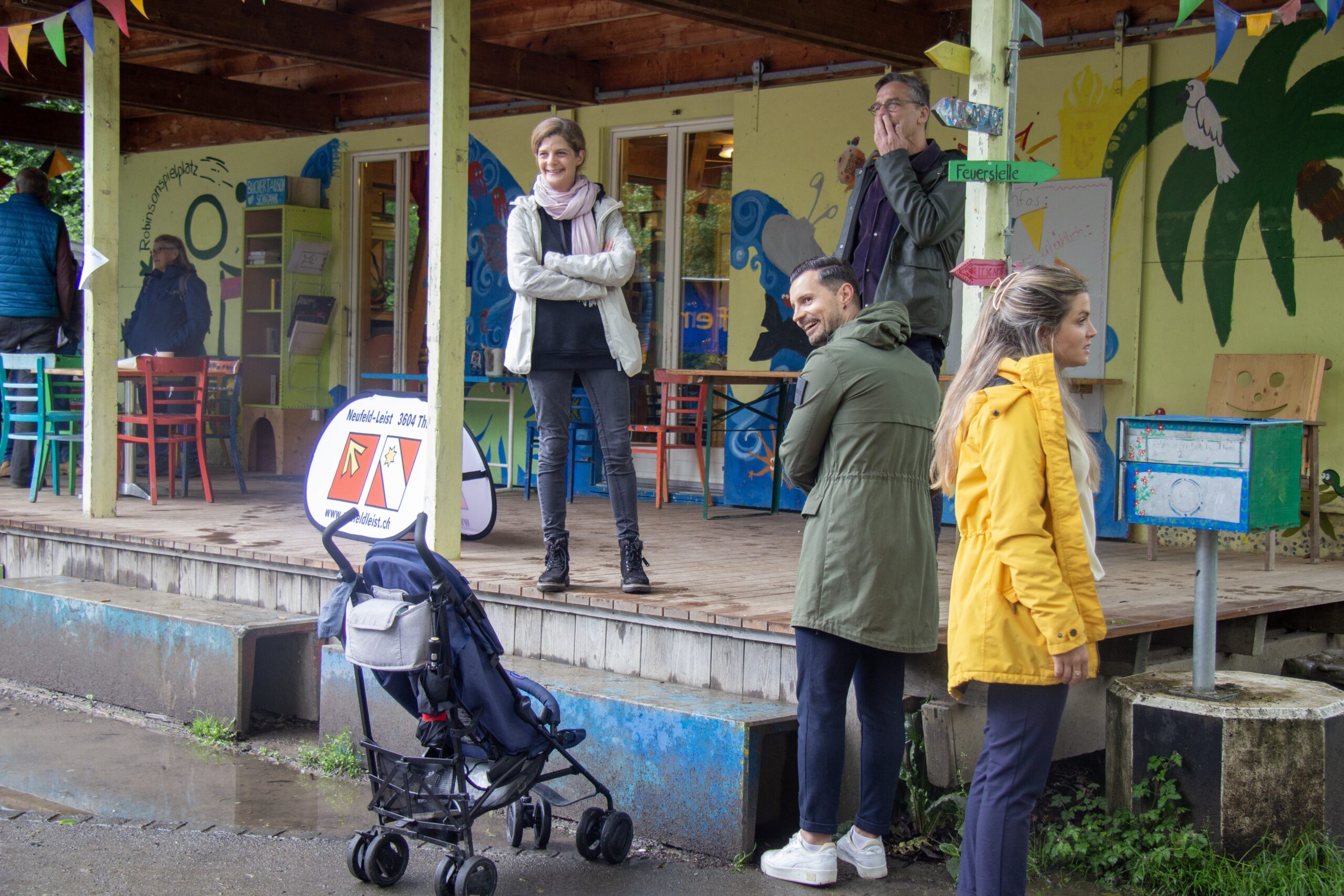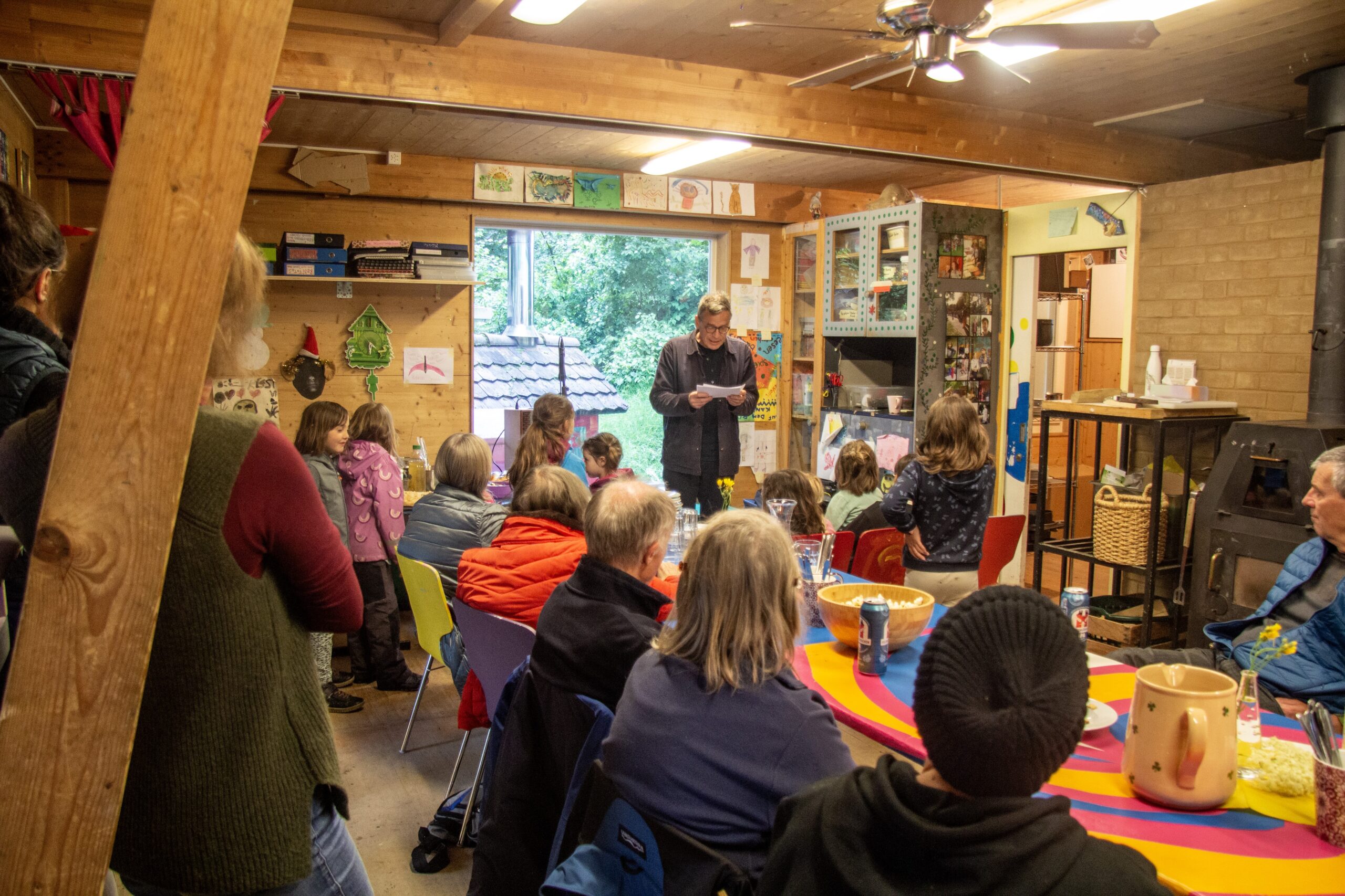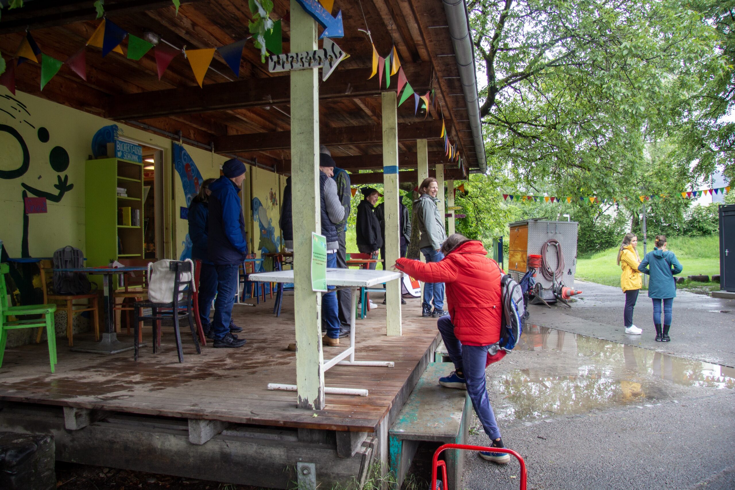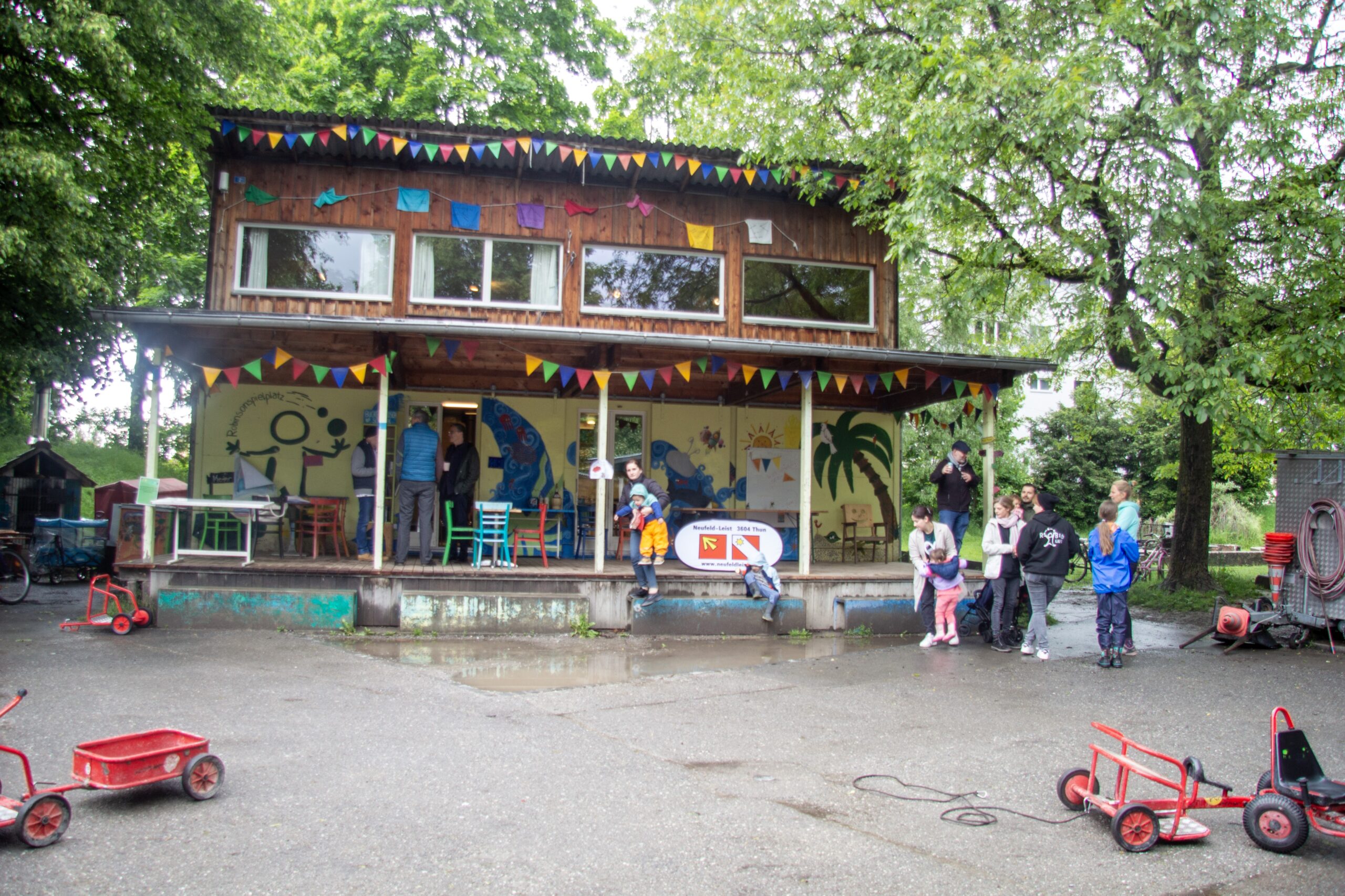 Nicht einmal der überschwemmte Vorplatz hielt die Kinder davon ab, vergnügt auf dem Robinsonspielplatz zu spielen. Trotzdem waren schliesslich alle froh – insbesondere die Eltern – als um 18 Uhr die Lesung von Guy Krneta begann. Die Geschichte über die Tomaten auf den Ohren musste er sogar zweimal erzählen… 🍅