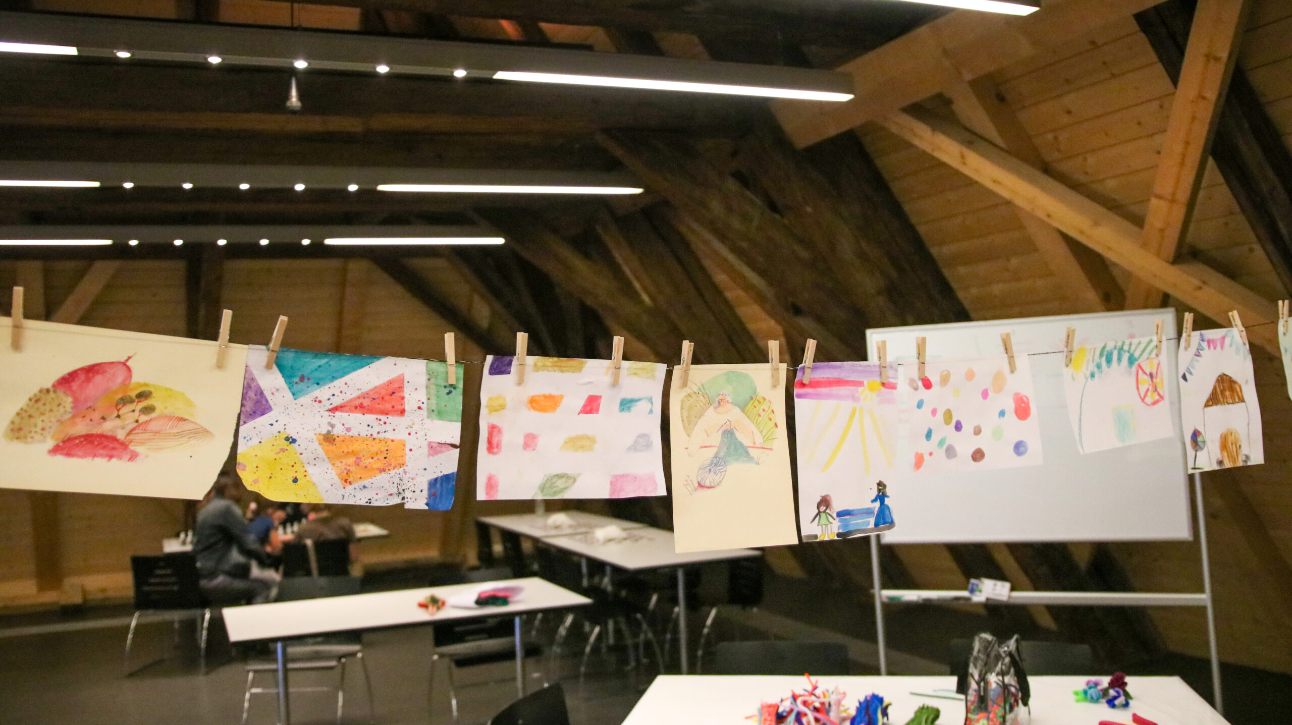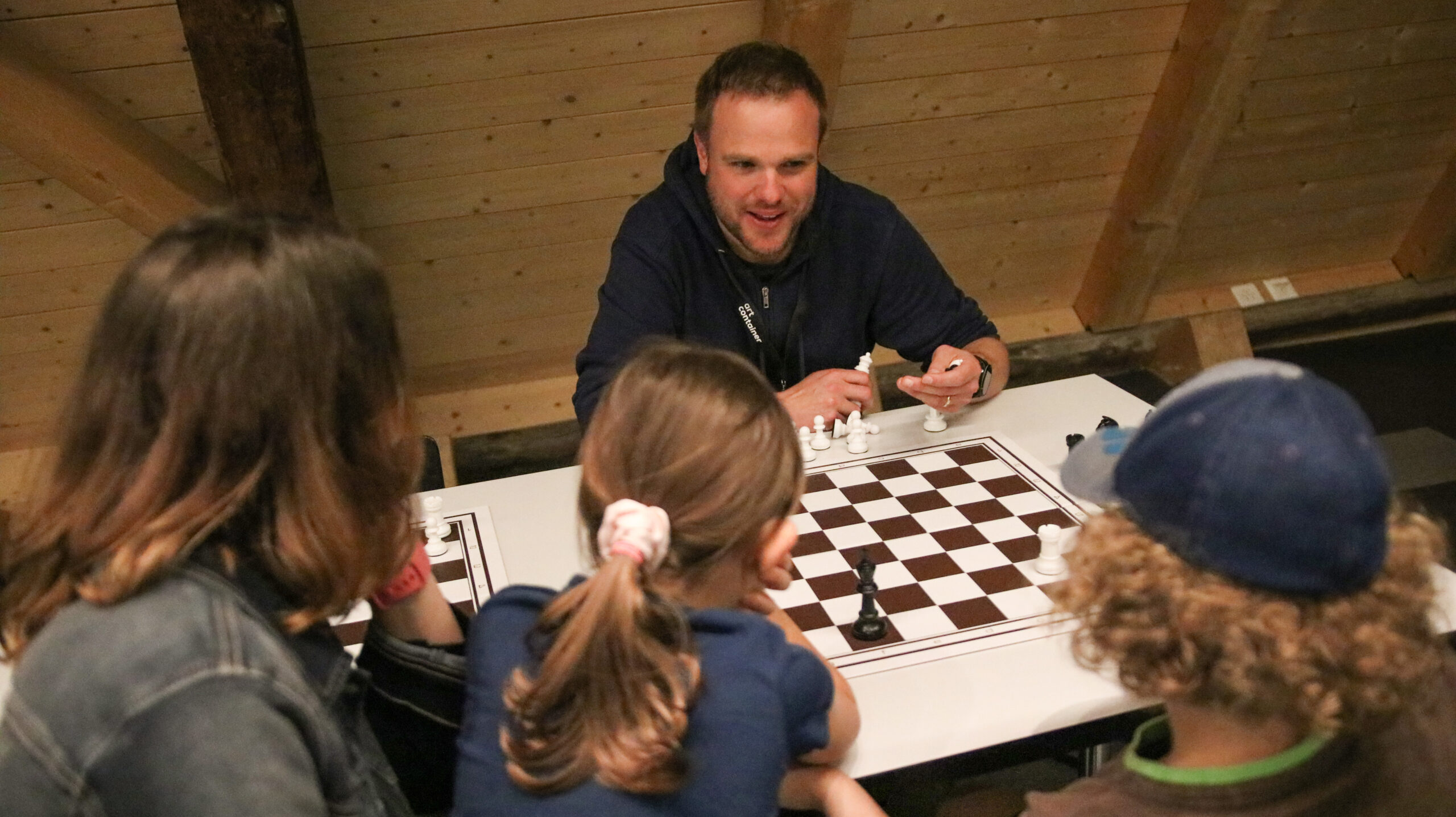 «Was chamer da mache?», fragt ein etwa 12-jähriges Mädchen, die Nase gerümpft, auf den letzten Treppentritten zum Dachstock. Es wirkt chaotisch hier oben, in jeder Ecke tummeln sich Kinder – und auch der Glitzer verbreitet sich schnell in alle Ecken. Chaotisch oder einfach lebendig? Rahel Feldmann und Silvia Heller von der Strickbar Wullelade in Steffisburg stricken, plaudern und unterstützen «Gwundrige» bei ihren Strickversuchen, Michael Grundbacher von der Reformierten Kirchgemeinde Steffisburg wird von Jung und Alt zum Schachspielen herausgefordert – geschlagen wird er aber nie –, am Basteltisch sind insbesondere die Blumenfingerringe aus Pfeifenputzern beliebt und beim Maltisch entstehen die unterschiedlichsten Kunstwerke aus Wasserfarbe.