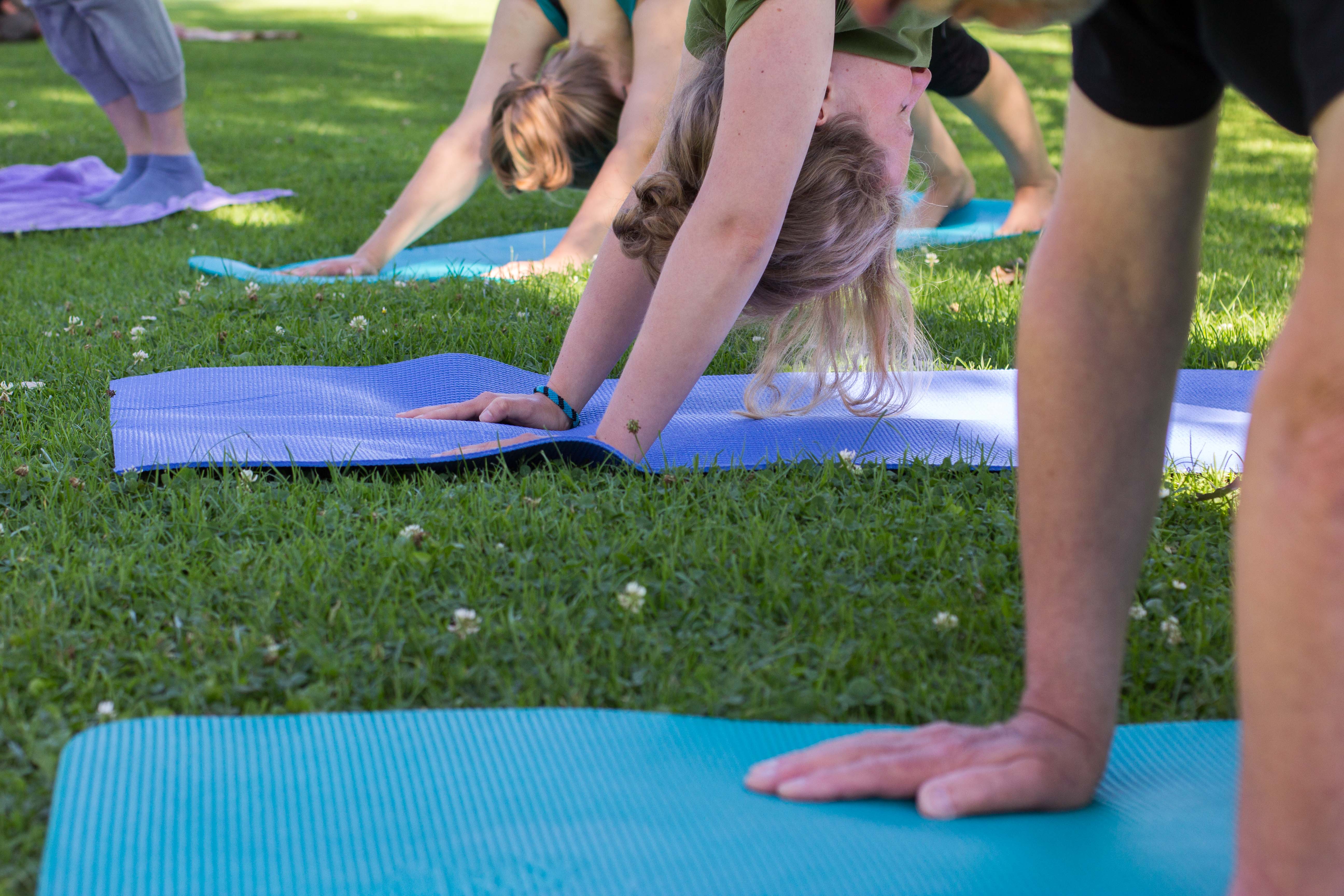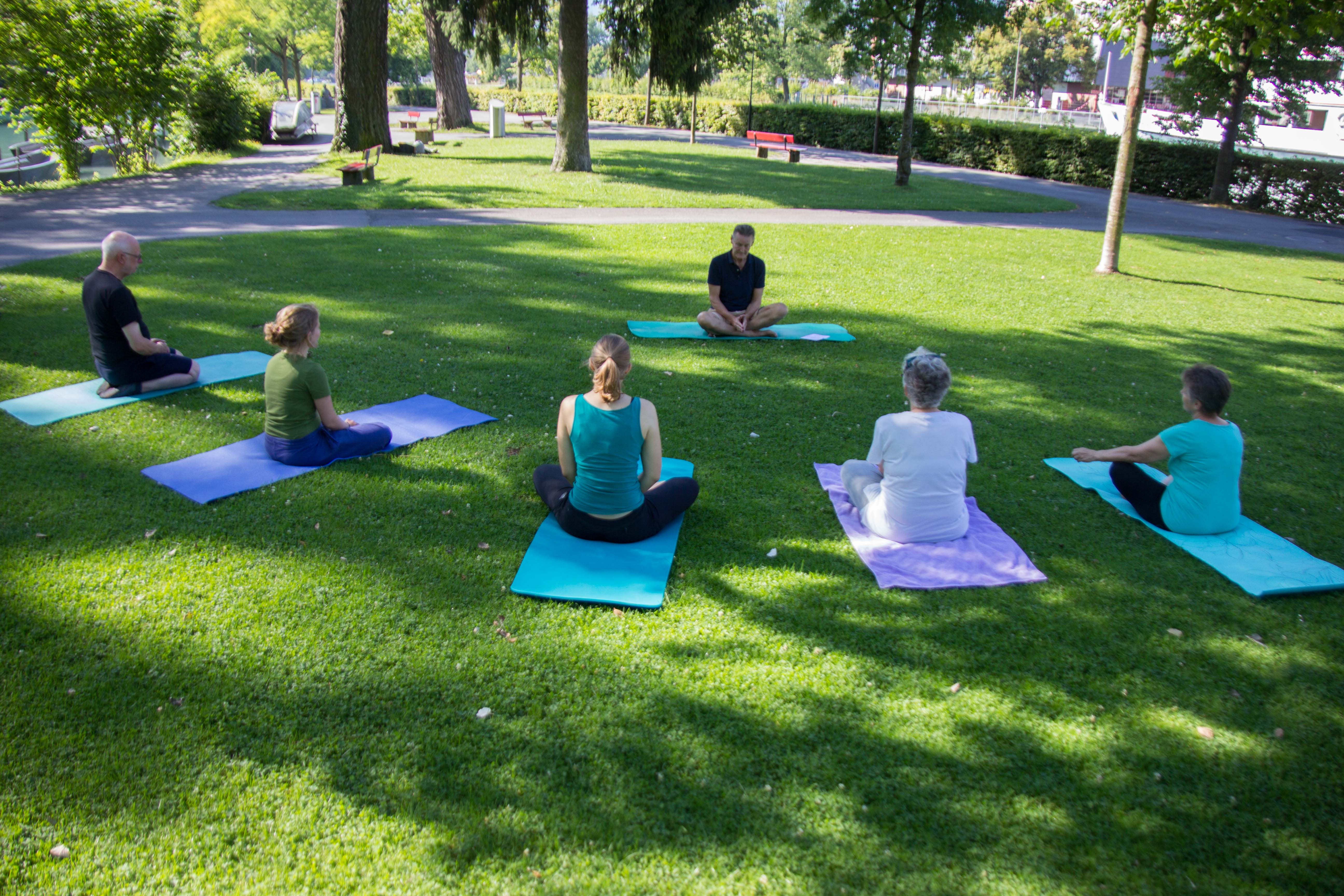 Vogelgezwitscher, grüner Rasen, Blätterrauschen im Wind, in der Ferne das Quietschen der Züge am Bahnhof und zwischendurch einige Gesprächsfetzen von SpaziergängerInnen. In dieser stimmigen Atmosphäre und im Schatten der grossen Bäume auf einer kleinen Insel in Thun findet sich eine Runde motivierter Yogis, die bereit sind, in aller Öffentlichkeit ihre Mätteli auszurollen.