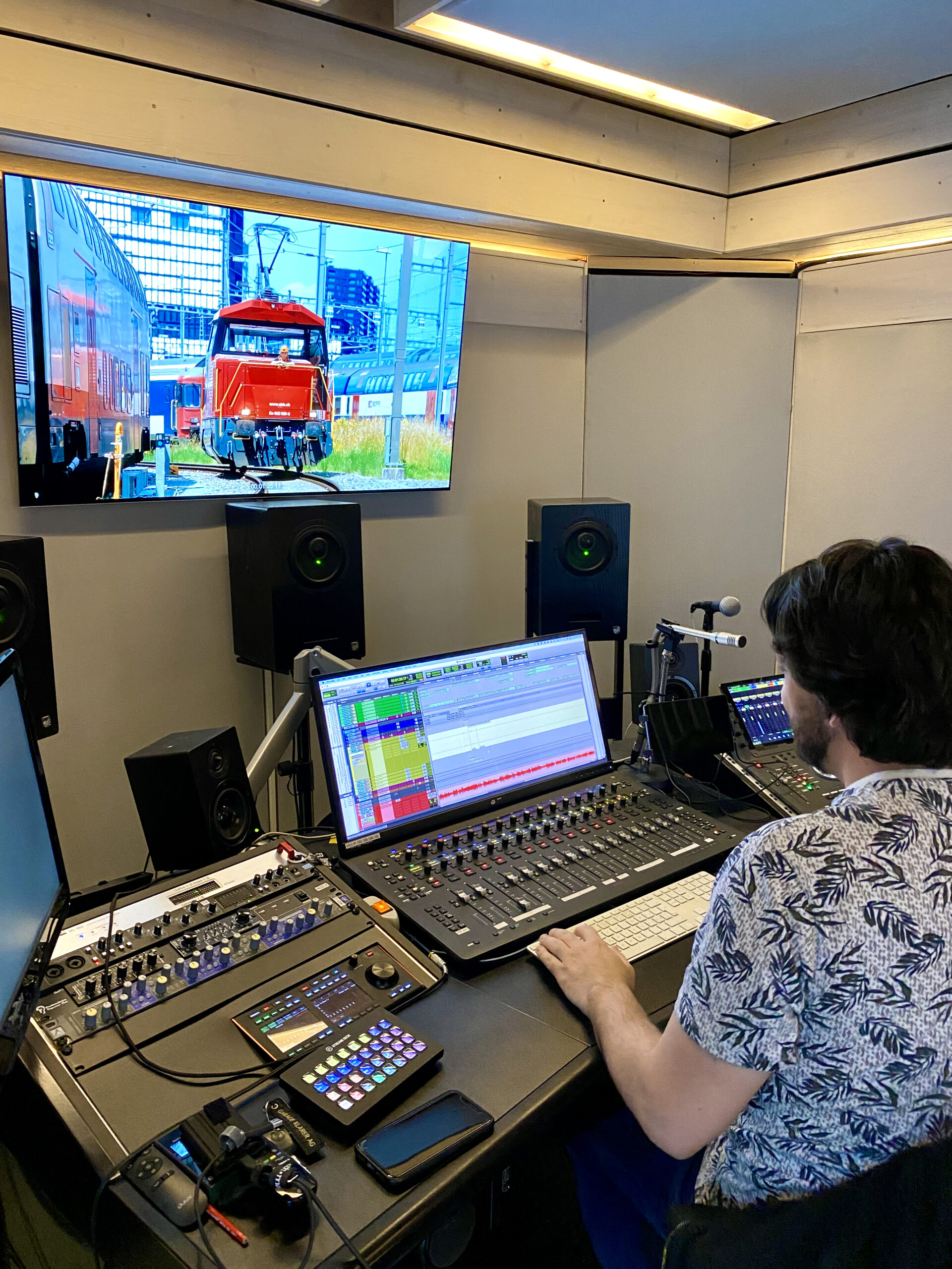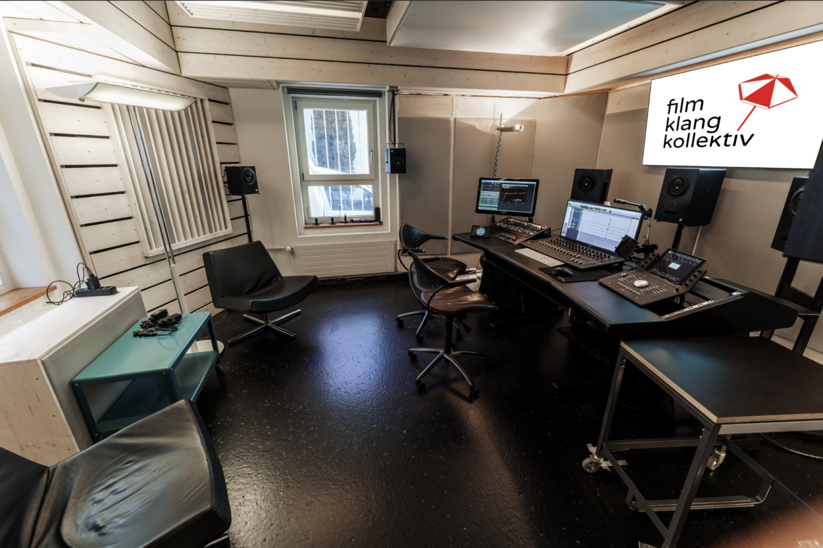 Wie die meisten modernen Studios ist das Film Klang Kollektiv digital aufgebaut. Das Herzstück des Studios ist die «Digital Audio Workstation» (eine spezialisierte Software) mit angeschlossenen «Audiointerfaces». Ein Audiointerface wandelt die analogen Mikrofonsignale in digitale Signale um. Der Computer verarbeitet sie und sendet die bearbeiteten Signale zu den Lautsprechern im Abhörraum, wo sie beurteilt werden. Ähnlich wie ein Computer durch eine Maus gesteuert wird, dient das Mischpult, oder besser gesagt der Controller, zur Steuerung der Digital Audio Workstation. Martin nennt das Mischpult auch seine «glorifizierte Maus», denn im Gegensatz zur früheren analogen Technologie fliessen heute keine Audiosignale mehr durch die Regler.