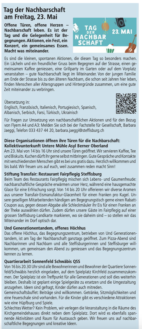 Hinweis auf das Angeobt von UND Generationentandem am Tag der Nachbarschaft und auf das Offene Höchhus Fest, das am 24. Mai 2025 stattfinden wird. zu Anzeige 1 und Anzeige 2.