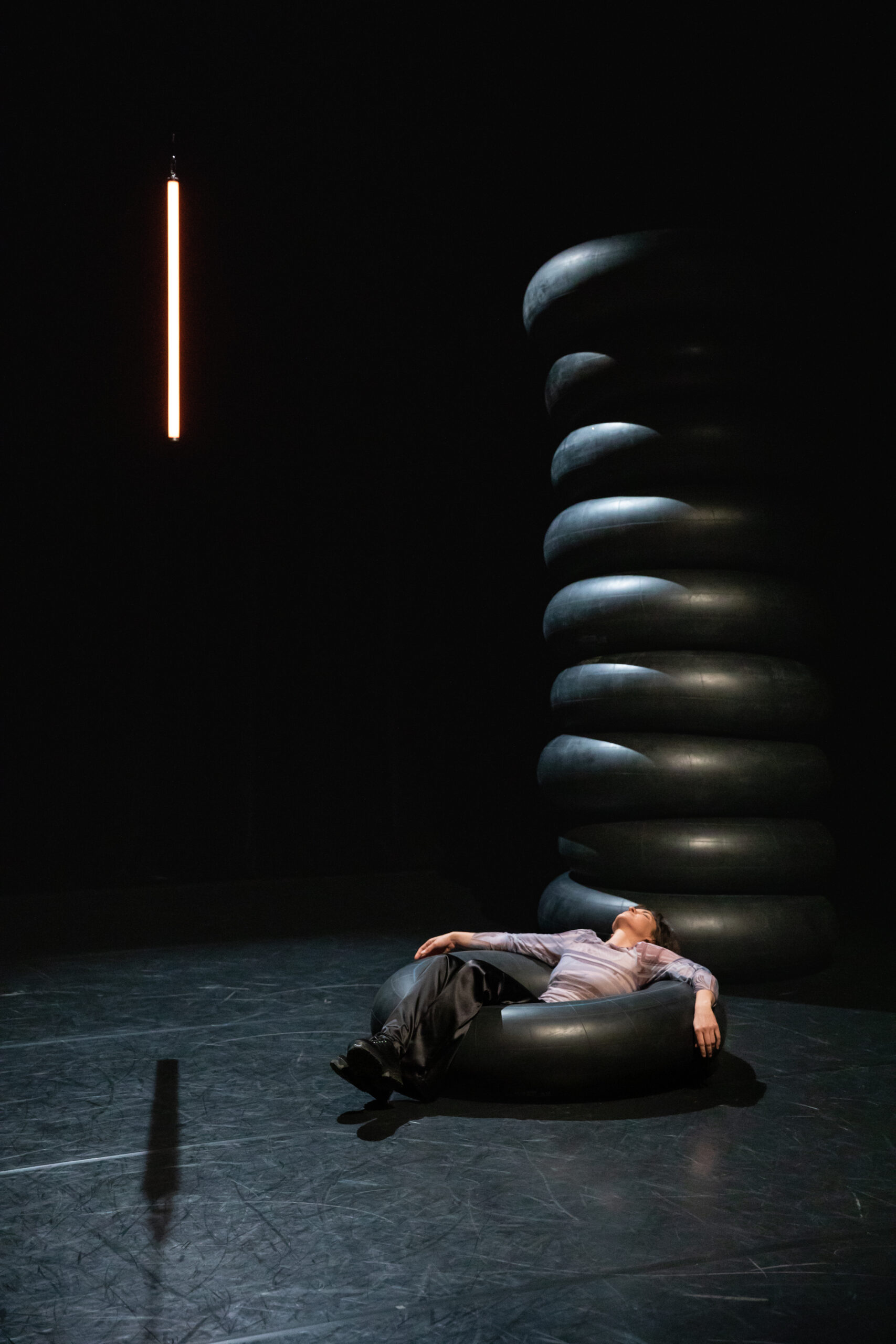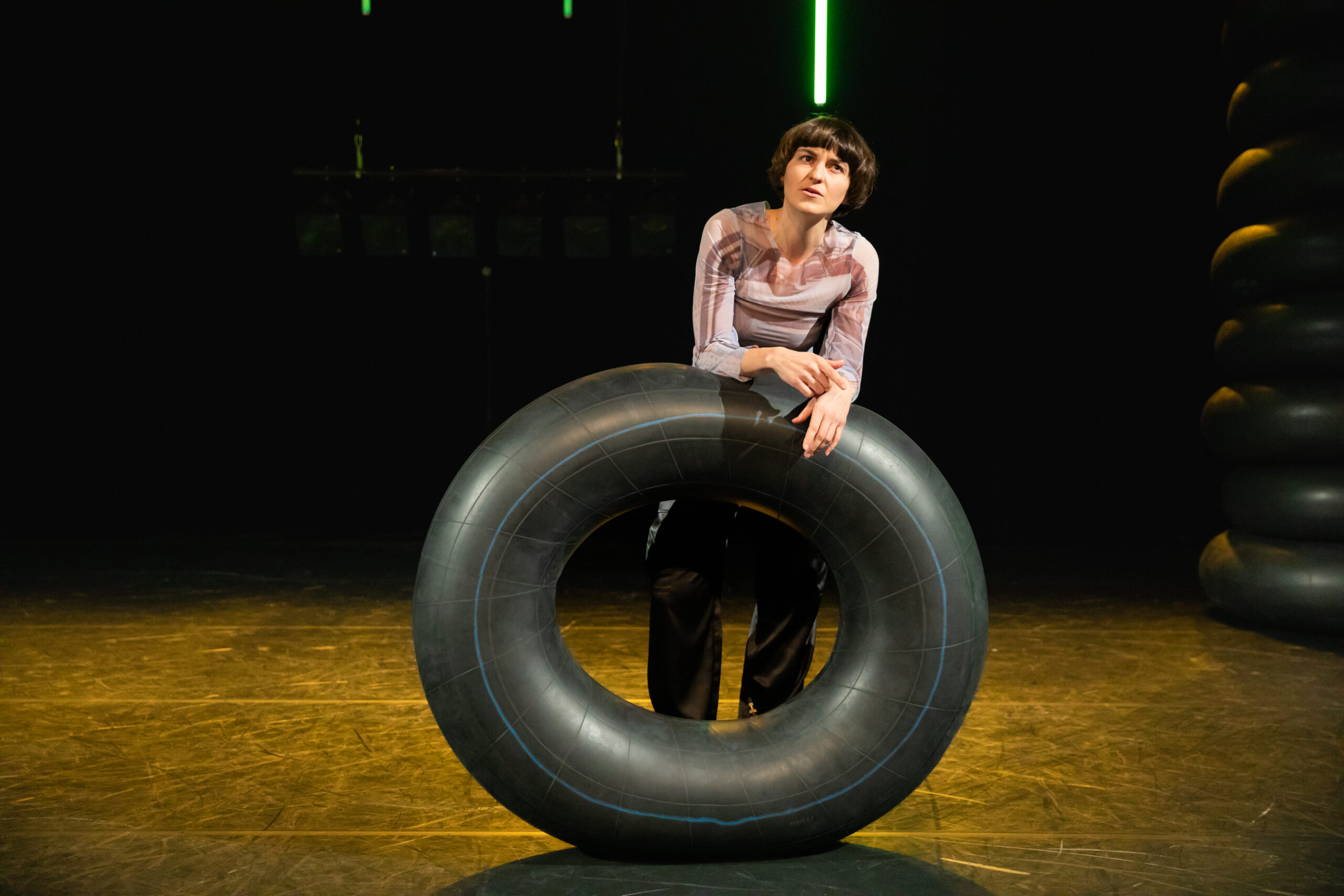 Dann betritt eine junge Frau, gespielt von Patricija Katica Bronić, die Bühne, legt sich in den Gummireifen und beginnt.