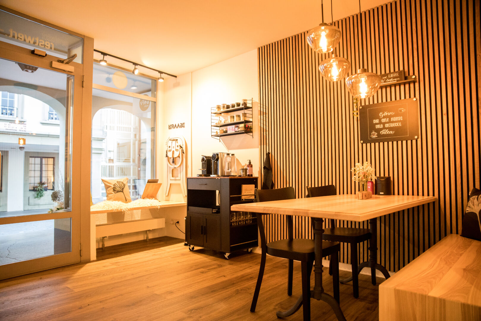 Zur Boutique gehört eine kleine Tee- und Kaffee-Ecke. Tee und Kaffee sind kostenlos. Wer herein kommt, kann Platz nehmen, eine kurze Auszeit geniessen, Zeitung lesen, arbeiten oder mit anderen ins Gespräch kommen. Der Raum ist bewusst so gestaltet, dass man ihn nicht nur zum Einkaufen aufsucht.