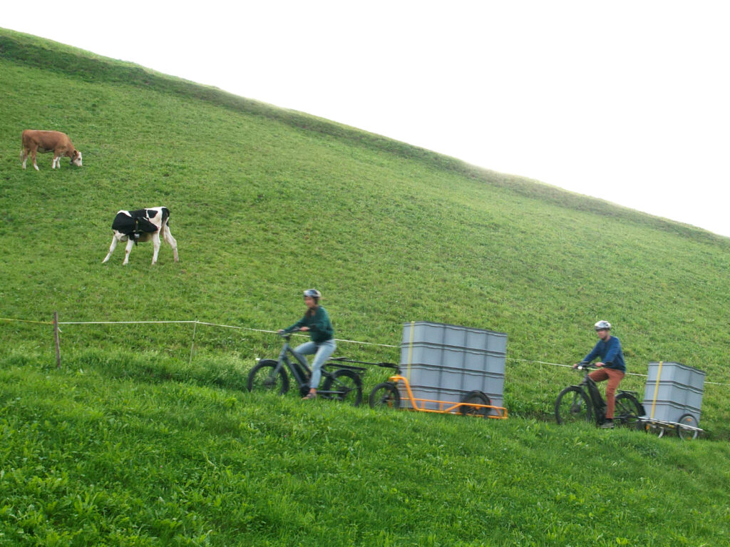 Auch die Auslieferung ist nachhaltig: Ronja Schlotterbeck und Claude Brechbühl verteilen die Gemüsetaschen mit dem E-Bike. – Bild: Privat