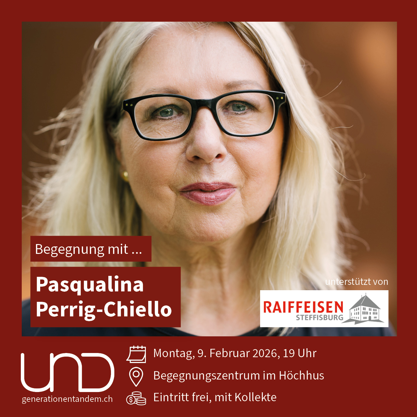 Ein Abend mit einer inspirierenden Persönlichkeit: zuhören, diskutieren, mitdenken. «Begegnung mit … » von UND Generationentandem lädt zum Austausch mit Menschen aus Politik, Wissenschaft oder Kultur ein. Dieses Format ist – neben Generationentalks, Politpodien, Generationenforen – ein fester Bestandteil des Programms von UND Generationentandem. «Begegnung mit …» wird unterstütz von der Raiffeisenbank Steffisburg.