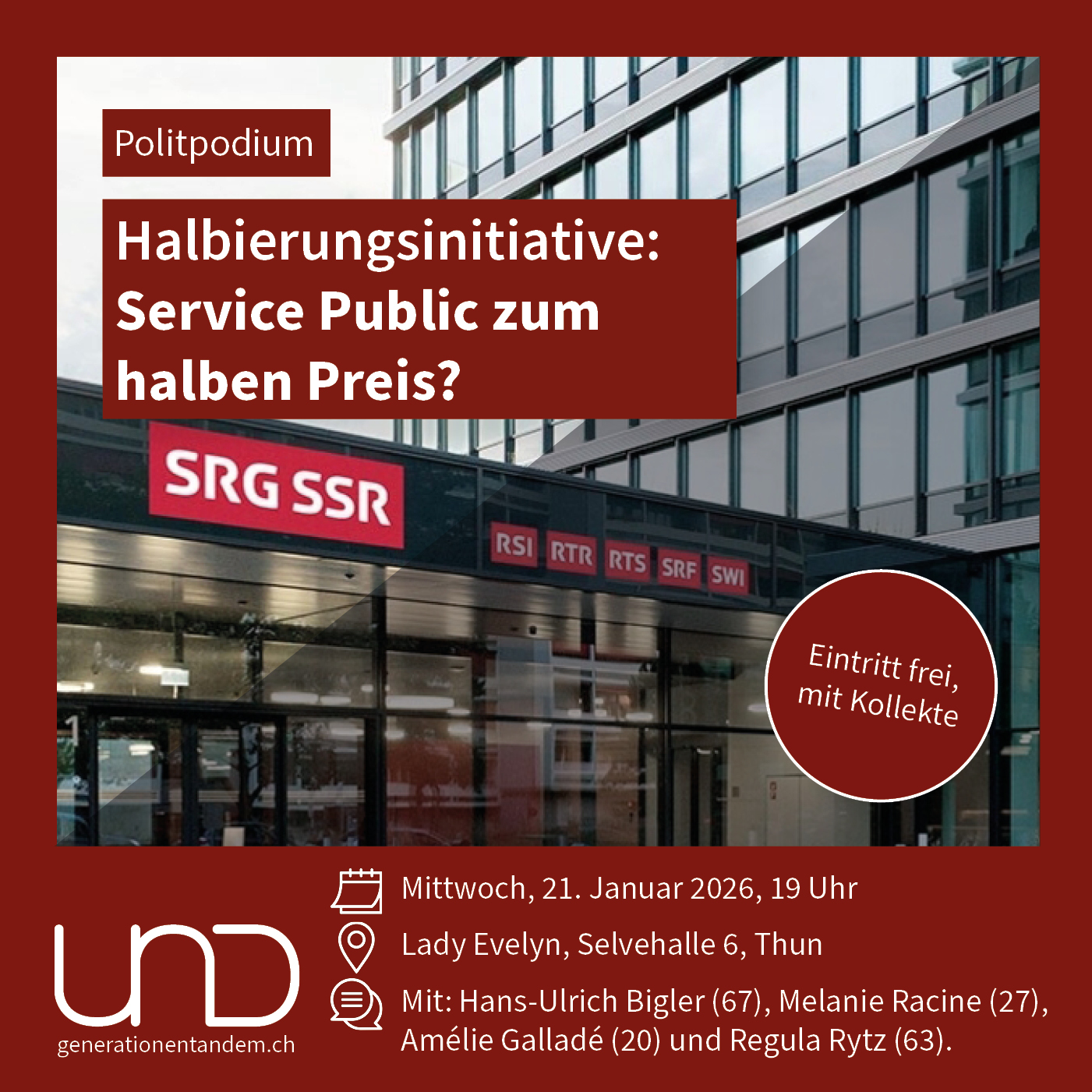 Die Halbierungsinitiative fordert eine Senkung der Radio- und TV-Gebühr von 335 auf 200 Franken. Unterstützt von Wirtschaftsverbänden und bürgerlichen Kreisen, zielt sie auf eine Verschlankung der SRG und eine finanzielle Entlastung. Gegner:innen warnen vor massiven Einschnitten bei Informationsvielfalt, Kultur und dem Service Public. Wie verändert sich der Journalismus, wenn öffentlich-rechtliche Medien weniger Geld erhalten und der Service Public insgesamt unter Druck gerät? Und welche Rolle spielt Medienförderung für Demokratie und Meinungsbildung?