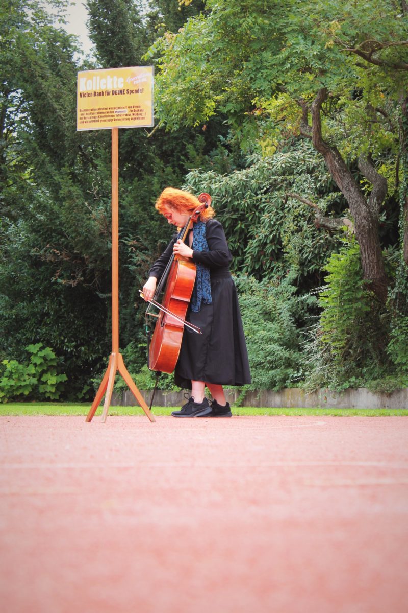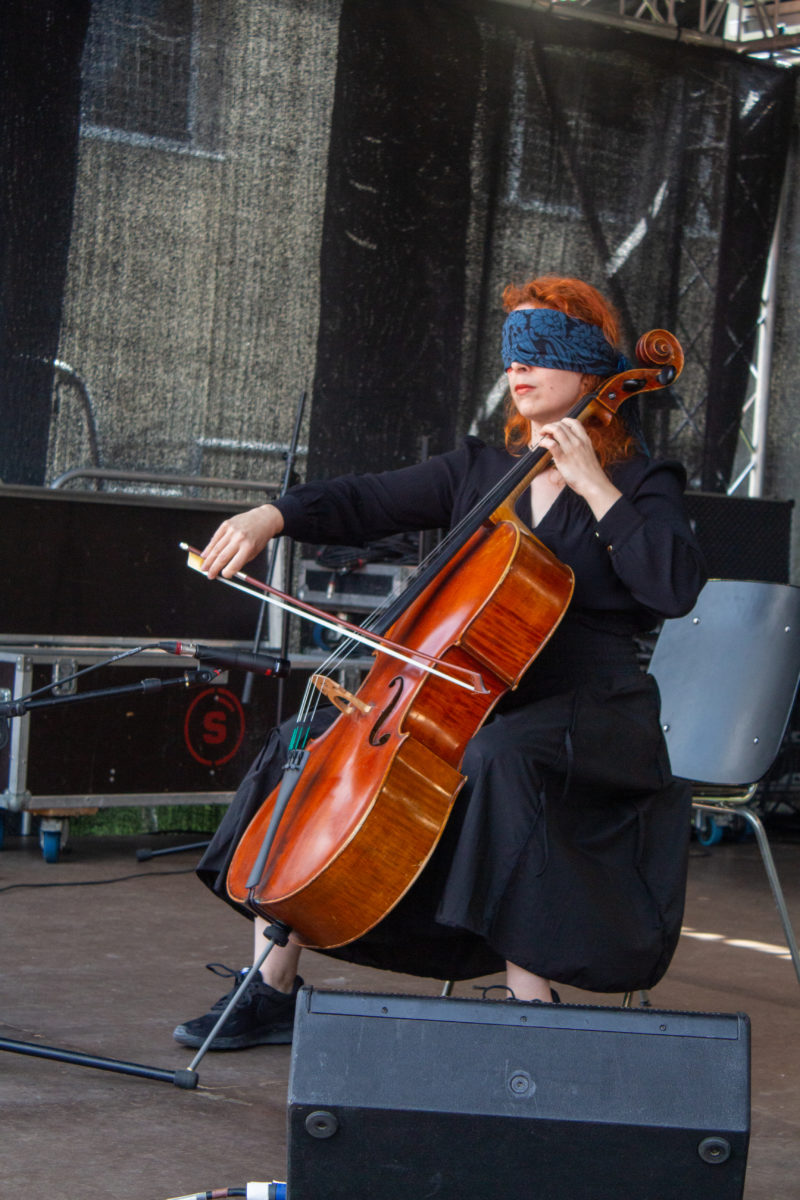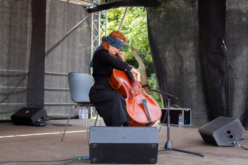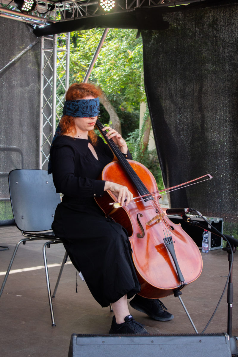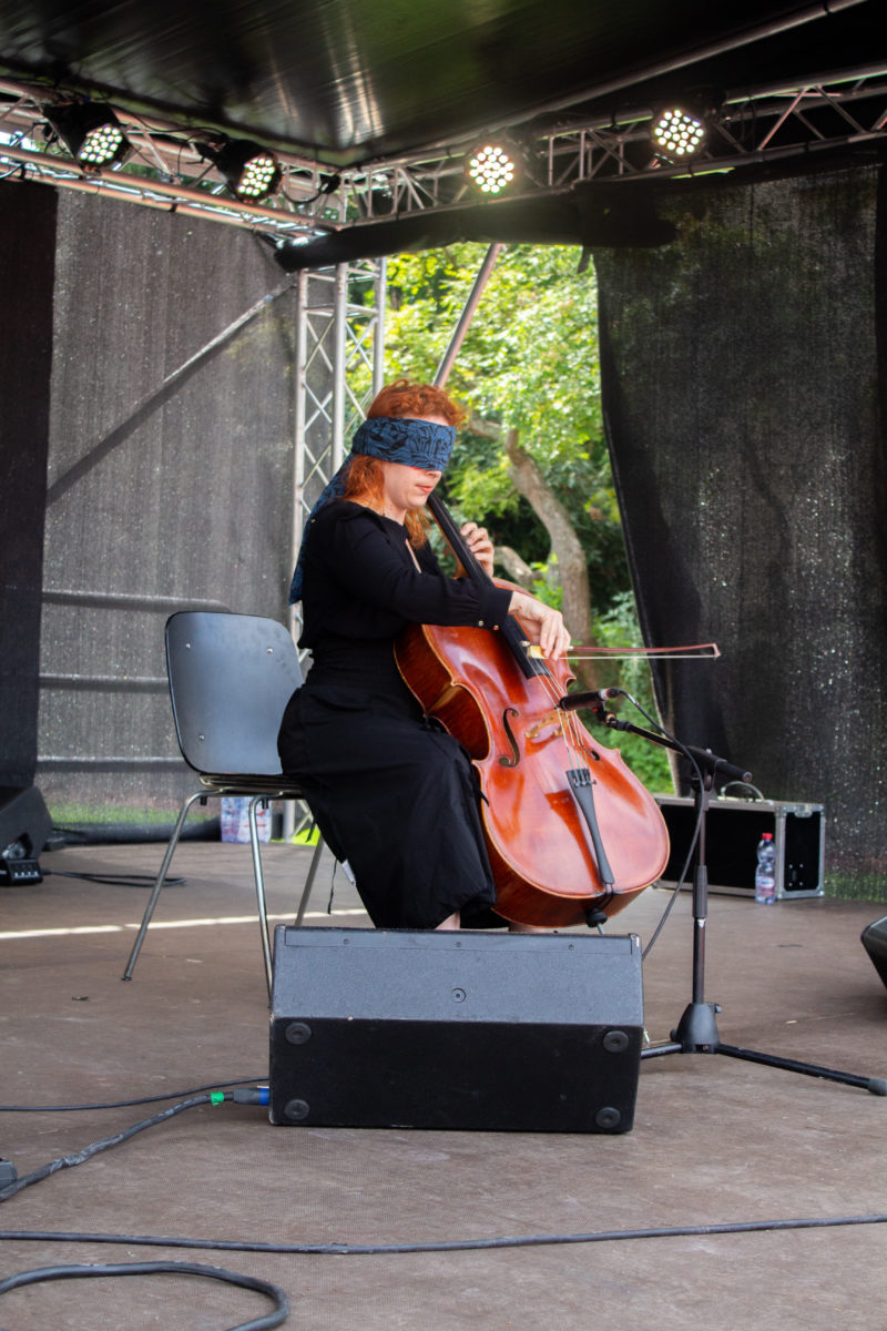 Die Cellistin und Performerin Claudia Kühne spielt sich in ihrer Kurzperformance zwischen Draussen und Drinnen, alten und neuen Klängen