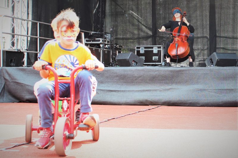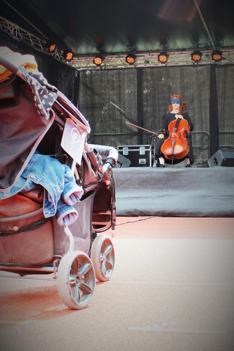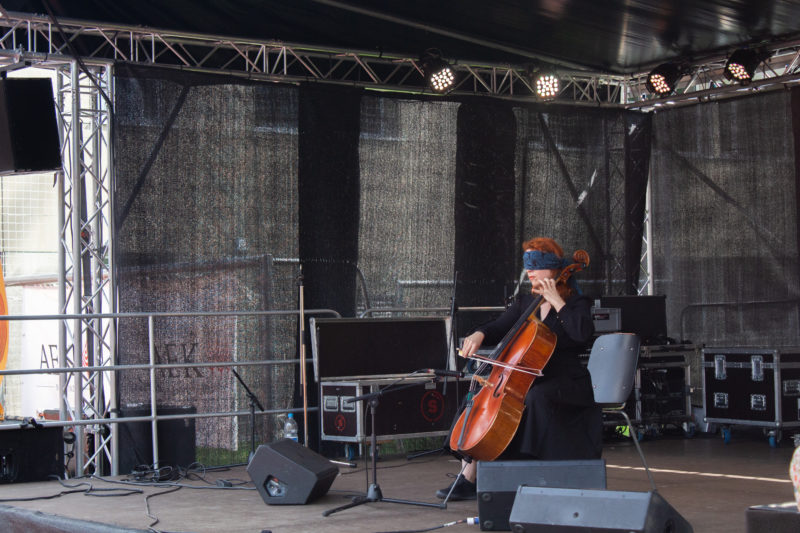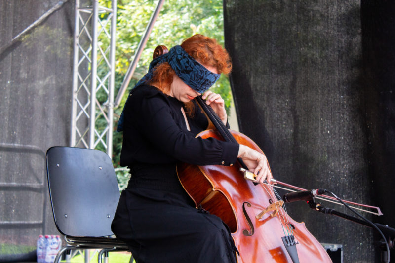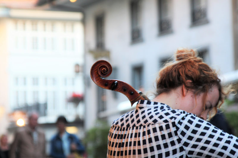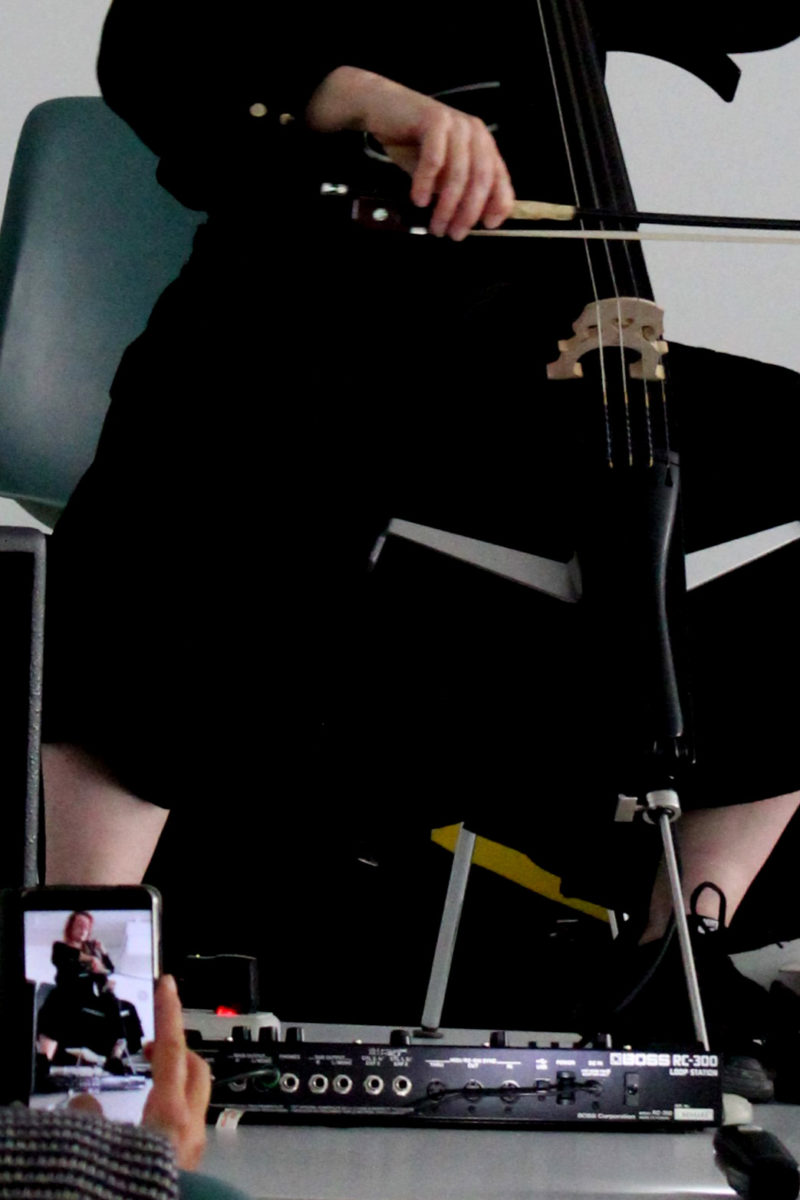 Die Cellistin und Performerin Claudia Kühne spielt sich in ihrer Kurzperformance zwischen Draussen und Drinnen, alten und neuen Klängen