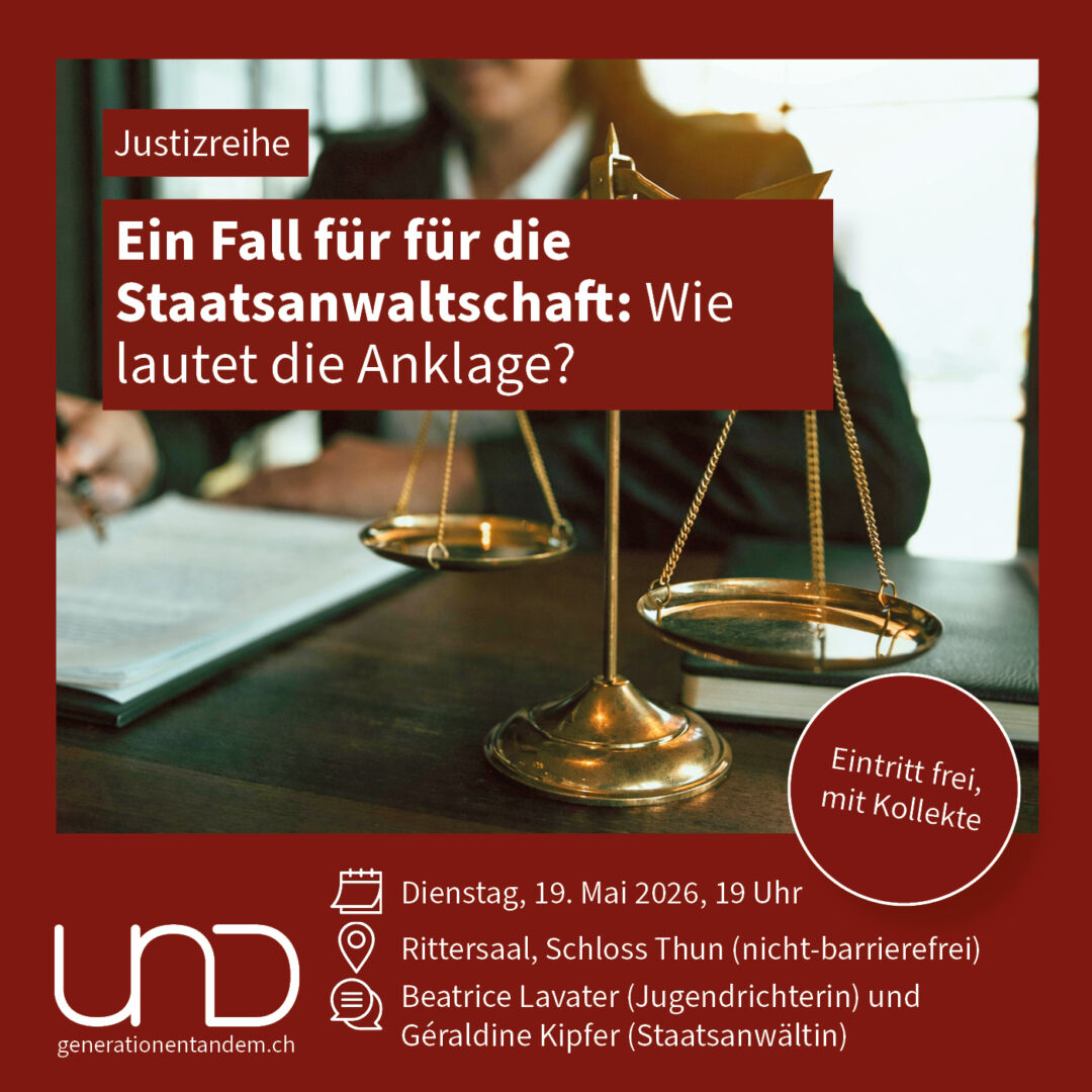 Ob Mord, Betrug oder Raserei – einer widerrechtlichen Tat sollen Urteil und Sühne folgen. Wie arbeitet die Justiz als Dritte Gewalt im Staat? Sind die ausgesprochenen Strafen gerecht, zeitgemäss, erfolgen sie rasch genug und sind alle Schweizer vor dem Gesetz gleich? Im Schloss Thun geben erfahrene Berufsleute an vier Abenden Auskunft über ihre Aufgaben und Arbeitsweisen.