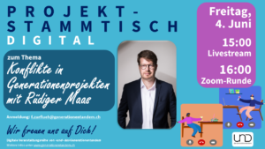 Menschen aller Generationen zu verbinden ist mit Corona noch wichtiger geworden. Generationenprojekte nehmen dabei eine gesellschaftliche Pionierrolle ein. Dabei entstehen viele Erfahrungen. Diese Erfahrungen, das erarbeitete Wissen und gemeinsame Themen wollen wir zusammenbringen. Seit 2012 lanciert der Verein UND Generationentandem unterschiedlichste Generationenprojekte. Mit dem Projektstammtisch digital bietet UND Generationentandem einen Austausch von und für ProjektdenkerInnen. Diesen Stammtisch gibt es seit Oktober 2020.