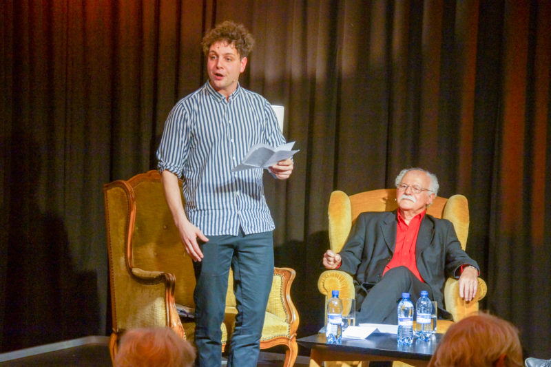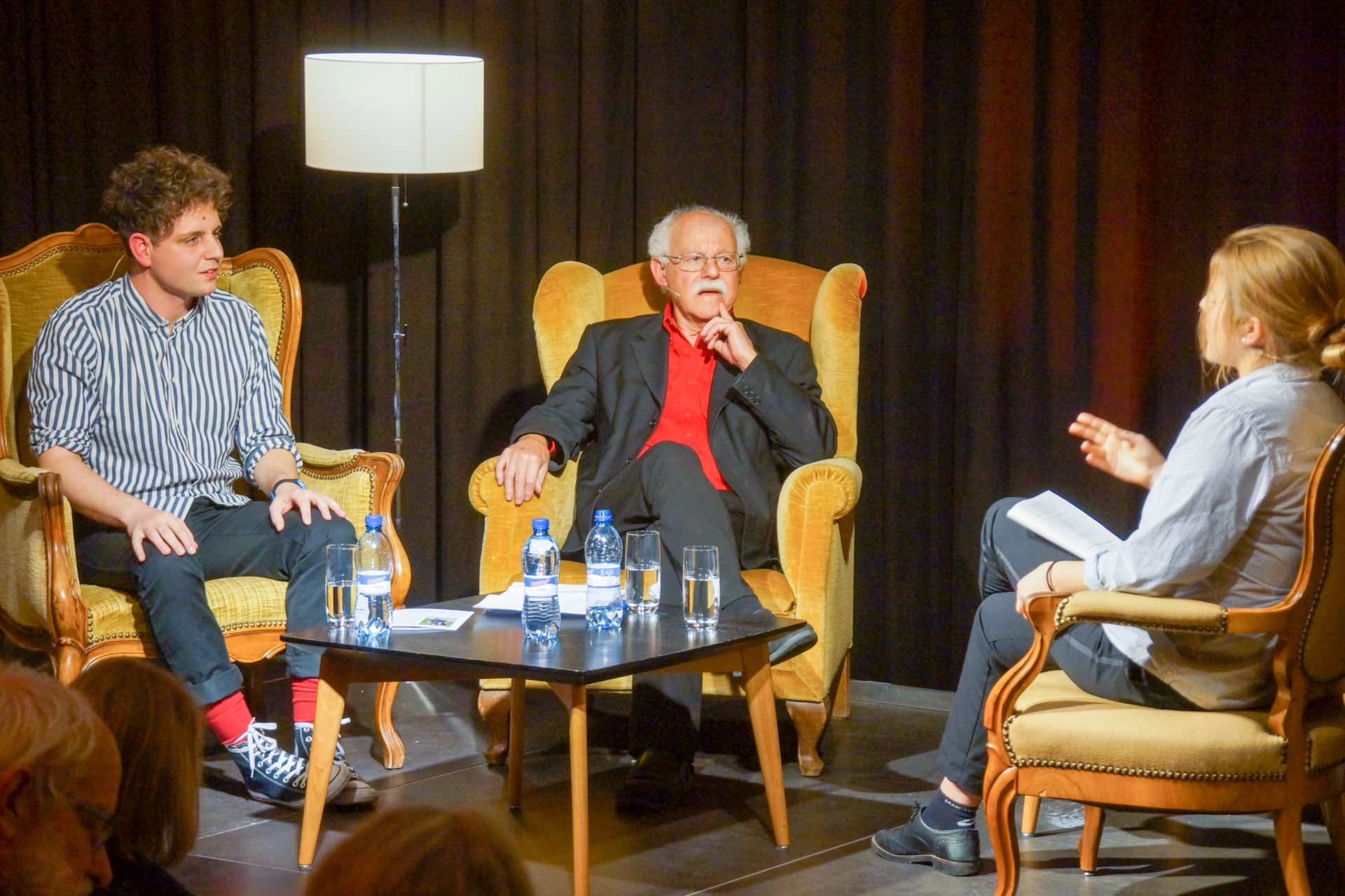 Dominik Muheim und Heinz Däpp performen im Generationentalk je einen satirischen Text und diskutieren über Sinn, Ziel und Grenzen der Satire.