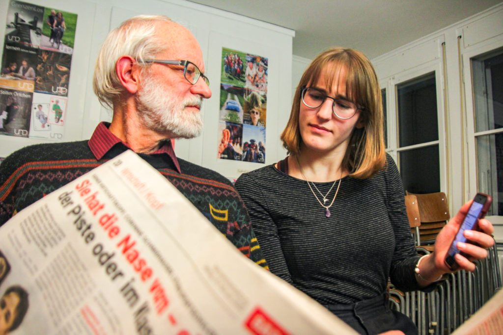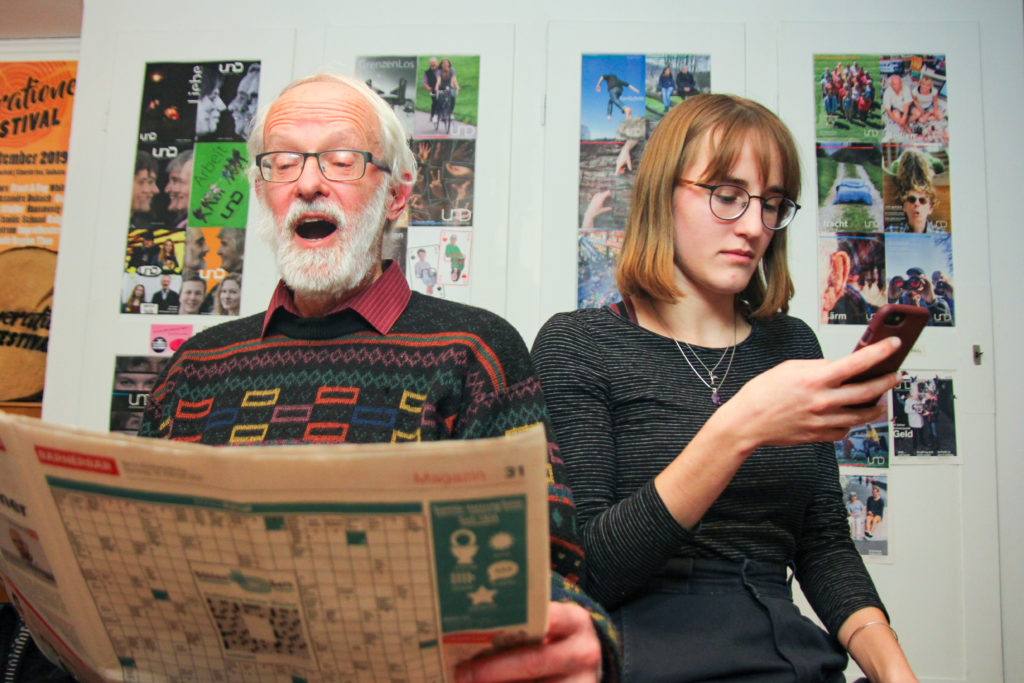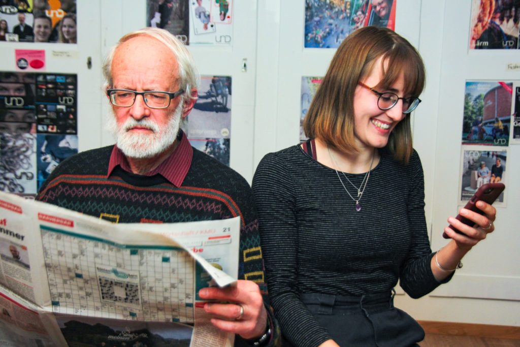 Dramatisch schalte ich mein Handy aus und packe es in meine Jackentasche. Mir gegenüber sitzen immer noch dieselben in die Zeitung vertieften, müden Gesichter. Verstohlen blicke ich auf die Titelseite, will etwas von den Neuigkeiten der realen Welt mitkriegen. Doch bevor ich die Überschriften lesen kann, surrt das Handy in meiner Jacke. Mich erreichen Pushmitteilungen von einer Nachrichten-App. Eilmeldung: Amoklauf in Thailand. Livestream: Impeachment: Trump wird freigesprochen. Kommentar: Ministerpräsident wird von AfD gewählt. Meine Gedanken: Drehen. Genervt verbanne ich mein Mobiltelefon ein für alle Mal im Rucksack. Die Endhaltestelle nähert sich, Zeitungen rascheln und Wintermäntel werden mühsam zugeknöpft. Etwas eifersüchtig richtet sich mein Blick auf die ZeitungsleserInnen. Ich bin mir sicher, dass sie ihre Zeit sinnvoller investiert haben. Dass sie sich Wissen angeeignet haben, anstatt über «Wanneer je iemands whatsapp profielfoto bekijt en per ongeluk op bellen tikt» (gefolgt von einem Trump-Bild, natürlich) zu lachen.