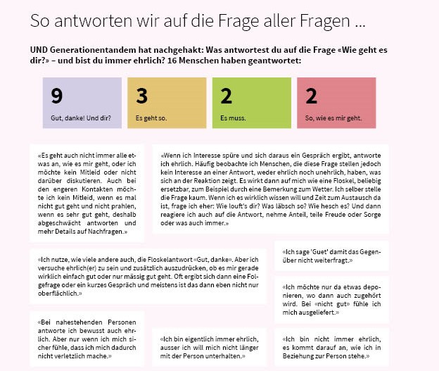 Bei all dem gibt es aber natürlich die ernst gemeinte Frage. Vor allem, wenn man weiss, dass es der angesprochenen Person schlecht geht. Da spricht die Frage Mitgefühl aus und verdient eine ernsthafte Antwort.