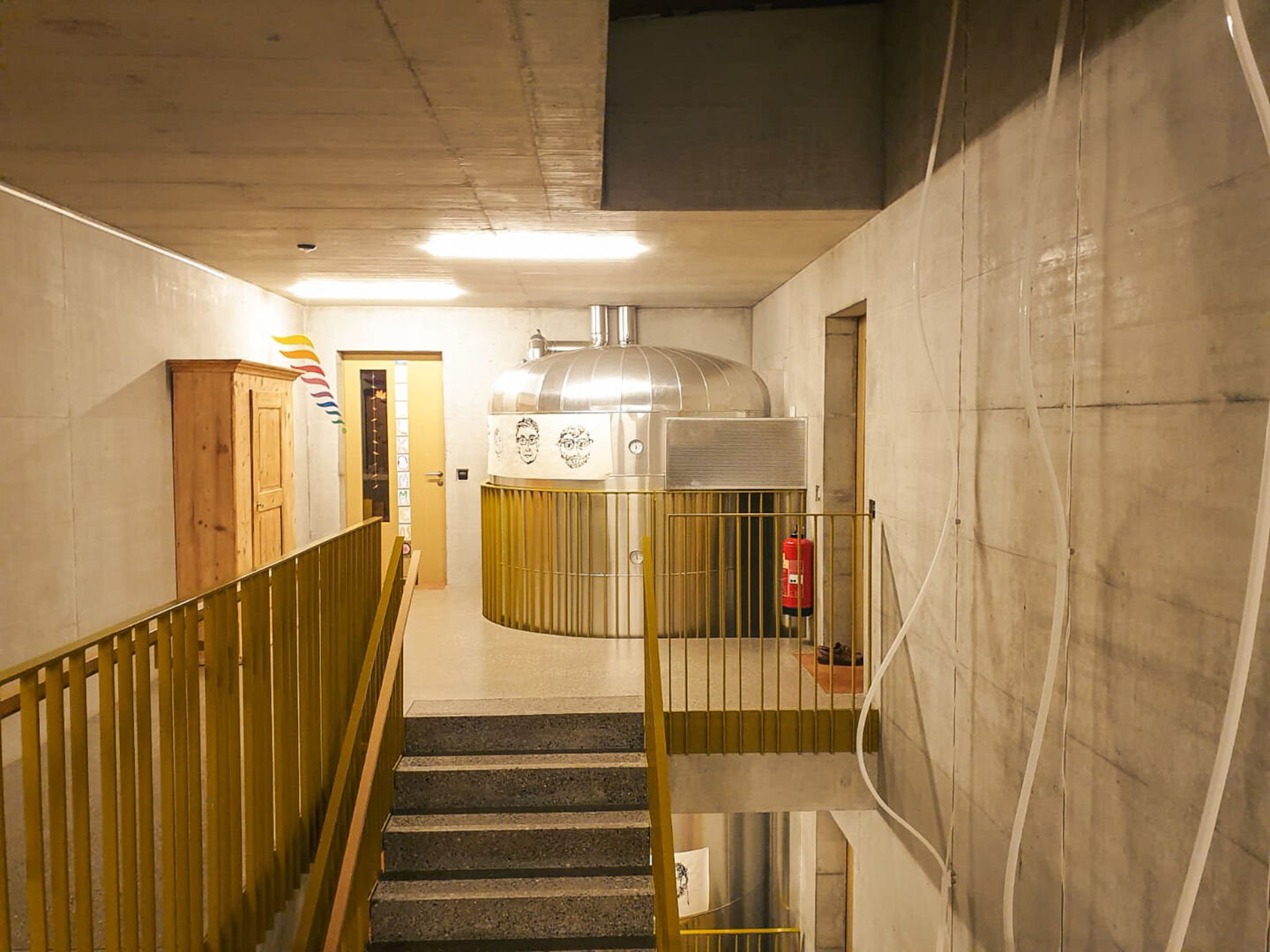 Der Warmwassertank, der 30’000 Liter fasst, reicht von hier bis ins oberste Stockwerk. Hier unten ist er hinter einer Mauer verborgen, oben im Treppenhaus ist er ein Blickfang. Ein Kellerabteil dient als Lebensmitteldepot, die en gros eingekauft werden. An einem anderen Abteil steht geschrieben: «Leihbar».