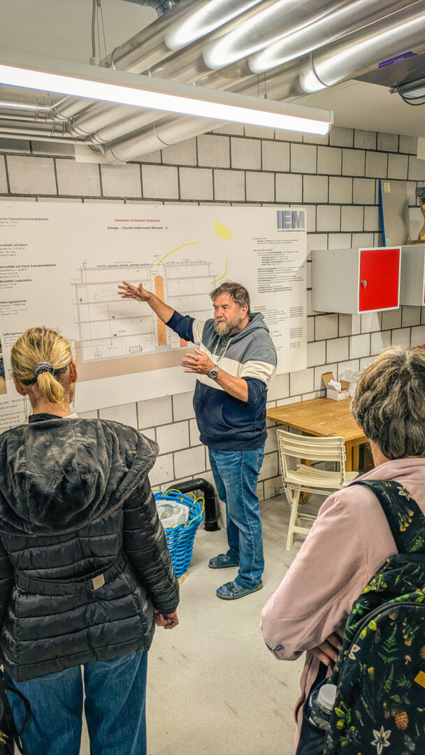 Wir steigen zuerst in den Keller hinunter, wo wir von Jeanpierre empfangen werden. Sofort fällt hier auf: Keine Tiefgarage, sondern Veloabstellplätze à gogo. Wir sehen die Heizungsanlage und die Anzeigetafel für die Fotovoltaik. Das Haus produziert in der Jahresbilanz 110 Prozent der für das Solarhaus benötigten Energie.