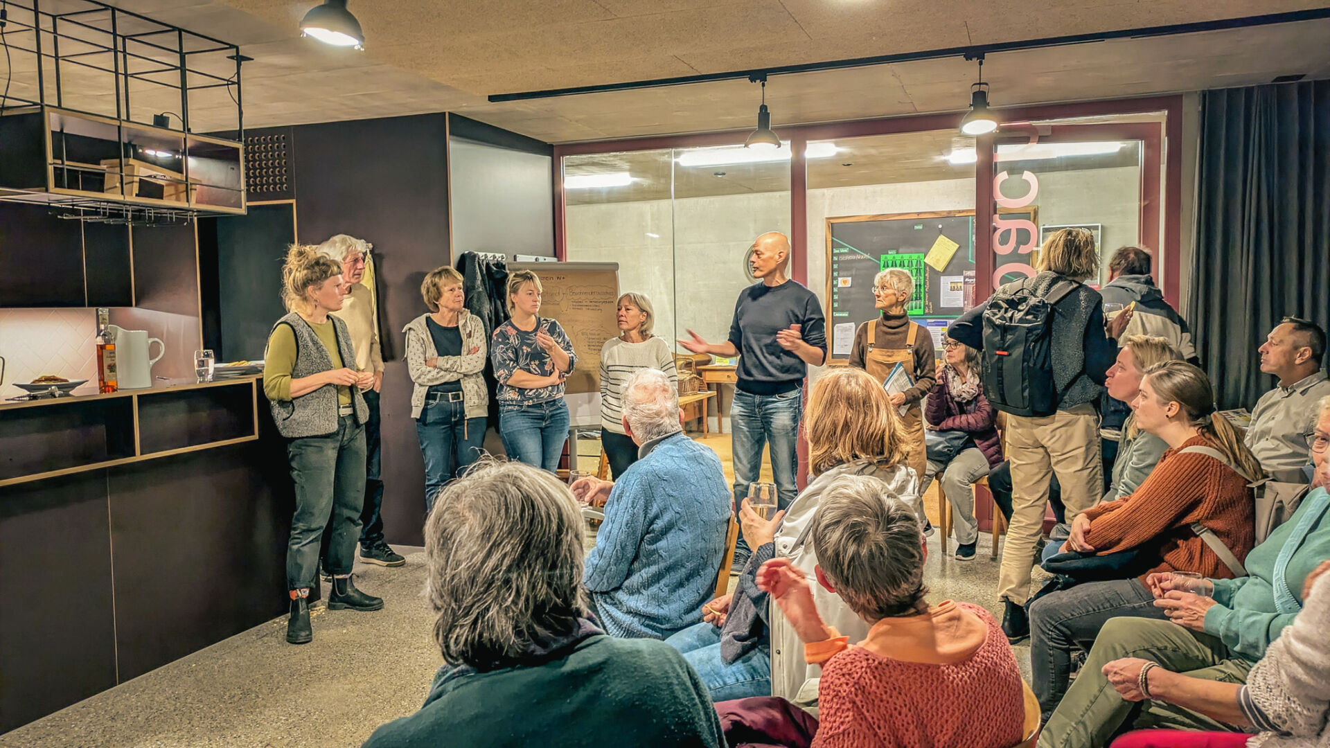 Am zweiten Anlass der Veranstaltungsreihe «Drei Mehrgenerationenprojekte stellen sich vor» finden sich rund 40 Personen im Bistro Mühlibach ein, um an der besonderen Führung durchs wohnenplus-Mehrgenerationenhaus teilzunehmen.
