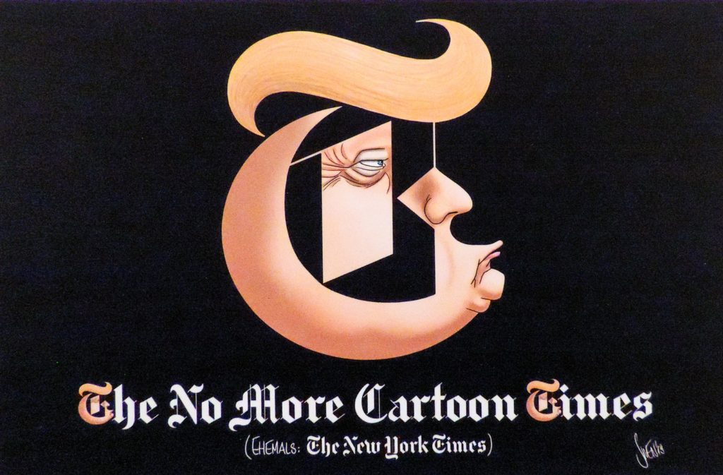 Das in Lachs-Fleischfarbe gehaltene Gesicht von Donald Trump ist absolut minimalistisch vor schwarzem Hintergrund gesetzt. Seine beiden Markenzeichen – die Haartolle, der Karpfenmund – sind deutlich erkennbar. Hat er gerade in die Welt hinaus gezwitschert? Fünf Worte als Text und die Welt erstarrt erstaunt und nimmt schmunzelnd zur Kenntnis, dass ER keine Karikaturen mehr duldet.