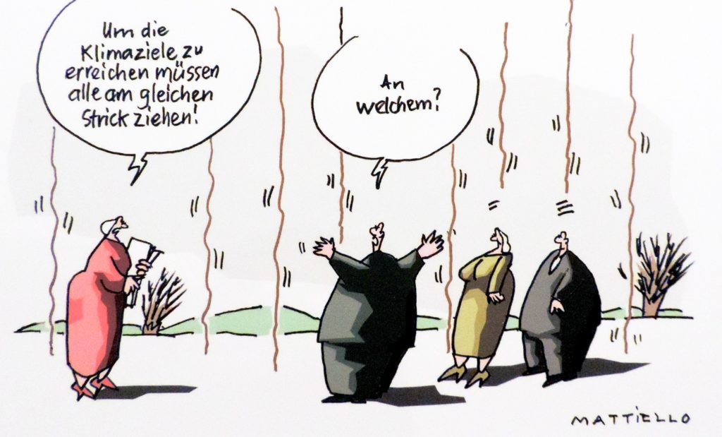 Lara Thurnherr (19): Ich habe eine Zeichnung von Ernst Mattiello gefunden, die mir sehr gefällt. Obwohl der Witz «meiner» Karikatur, wie du, Heinz, sagst, mehr auf Sprache als auf Darstellung baut, spielt auch sie mit einer Metapher. «Alle müssen einfach am gleichen Strick ziehen», ist so einfach gesagt. In dieser Karikatur wird dieser Satz als leere Floskel entlarvt, als massive Vereinfachung eines Problems, dessen Lösungsweg eben nicht nur offensichtlich ist. Auch wenn das Ziel klar ist, kann man sich uneinig sein, welcher Weg am schnellsten dorthin führt. Es stört mich, wenn jeder Lösungsvorschlag, der nicht dem eigenen entspricht, auf Faulheit, Gier oder Bosheit zurückgeführt wird. Ob ich die Karikatur nur deshalb so gut finde? Es ist schließlich befriedigend, die eigenen Gedanken so anschaulich dargestellt zu bekommen. Aber ist das die Aufgabe von Karikaturen?
