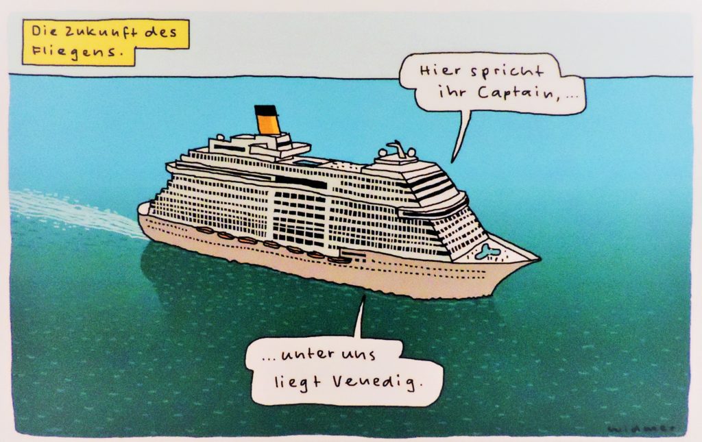 Miriam Weber (20): Ein Schiff, ein Mann und zwanzig Worte. Mehr brauchen Karikaturen nicht, um mich von ihren Ideen zu überzeugen. America first: Entstanden ist die Karikatur aus dem Nebelspalter im Juli 2019, als die New York Times ihren täglichen politischen Karikaturen ein Ende setzte. Ausgelöst wurde dieser einschneidende Schritt durch die Veröffentlichung eines «antisemitischen» Comics über Trump, der in der Zeichnung den Israelitischen Präsidenten Benjamin Netanyahu in der Form eines Hundes an der Leine führt. Auf die Veröffentlichung folgte ein Shitstorm und die renommierte Zeitung entliess ihre Karikaturisten. Satire darf doch nicht alles! Umso schöner, dass der Karikaturist Trump zu dem umwandelte, was er zerstören wollte und konnte: einer Karikatur der New York Times. Hätten die Zeichnungen der kritischen Karikaturisten doch alle eine solche umkehrende Magie, wer weiss, dann wäre Trump ein feministischer Pazifist und Venedig würde trotz des Klimawandels doch nicht versinken. Was natürlich sehr zu wünschen wäre, denn die «Zukunft des Fliegens» sieht weder für Touristinnen noch für die Italiener rosig aus. Die Pointe der geschickten Karikatur könnte den Untergang der Stadt heilsam überleben – das wiederum nur so lange, wie es die (wachsende?) Zensur zulassen wird.