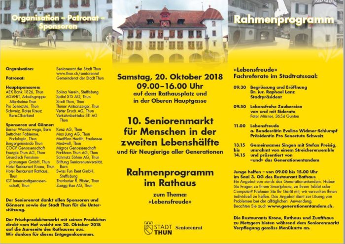 Am 20. Oktober 2018 findet der Seniorenmarkt Thun statt. UND Generationentandem ist dort gleich dreifach vertreten: Wir haben einen Werbestand; wir helfen euch vor Ort bei der verflixten Technik; und wir haben gemeinsam mit Stefan Preisig ein offenes Singen organisiert. Um 13:15 laden wir alle Singbegeisterten, und diejenigen, die es noch werden wollen, in den Rathaussaal ein. Gesungen werden Klassiker von «freut euch des Lebens» über «zwei kleine Italiener» bis hin zu «Lueget vo Bärge und Tal». Das offene Singen dauert etwa eine Stunde und ist gratis (Kollektenbüchse vorhanden). Untermalt wird es von einem Dreigenerationen-Geigentrio.