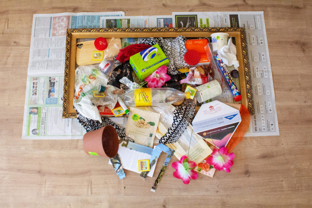Lieber Müllkunst als nur Müll! Unsere Einfälle, wie wir Abfälle geschickt anordnen und ihnen damit neue Bedeutung geben können, führten schliesslich zu den abgebildeten Werken.