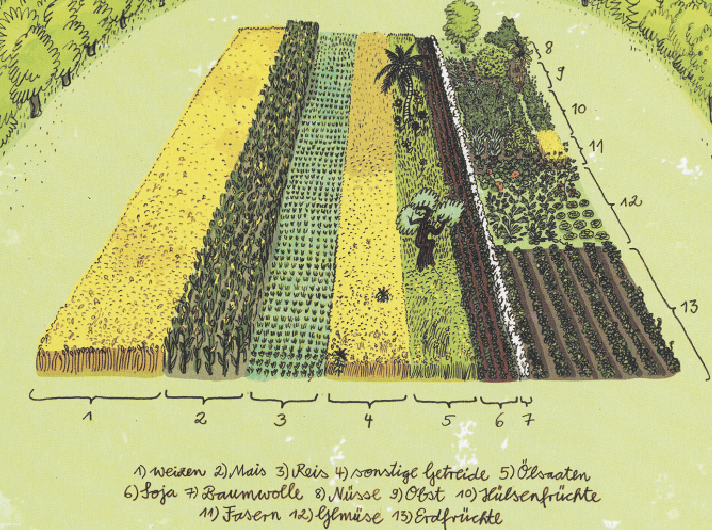 Das Herzensprojekt von Bastiaan ist der Weltacker. Die weltweite Ackerfläche von 1,4 Milliarden Hektaren geteilt durch die Zahl der Erdenbürger ergibt pro Nase 2000 Quadratmeter. Im Dorf Nuglar, im Kanton Solothurn, wurde ein Feld so angepflanzt, dass es dem weltweiten Verbrauch pro Person entspricht.