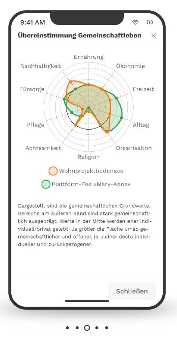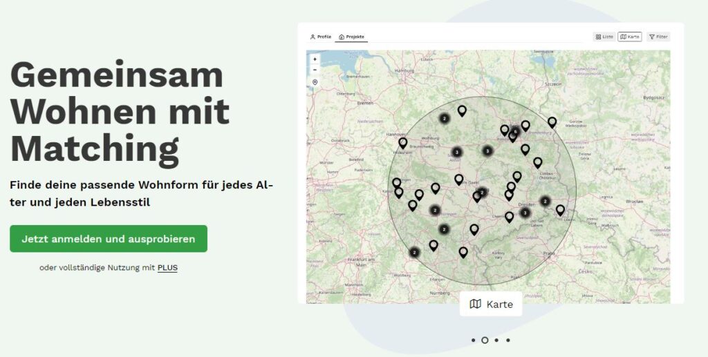 Vorgehensweise bei der Suche: Die Person, die ein Wohnprojekt sucht, muss sich vorab registrieren und ein möglichst vollständiges Profil zur individuellen Bedürfnisabklärung und Feststellung des Wohntyps online erstellen. Es wird zwischen drei unterschiedlichen Wohntypen unterschieden: A) Nachbarschaftlich wohnen mit vordergründiger Privatsphäre und gegenseitiger freundschaftlicher Hilfe. B) Gemeinschaftlich leben in Mehrgenerationenhäusern, Clusterwohnungen und Wohngemeinschaften. C) Wohnen in einer Lebensgemeinschaft nach einer bestimmten Idee, Lebensweise oder gemeinschaftlich formuliertem Zweck.