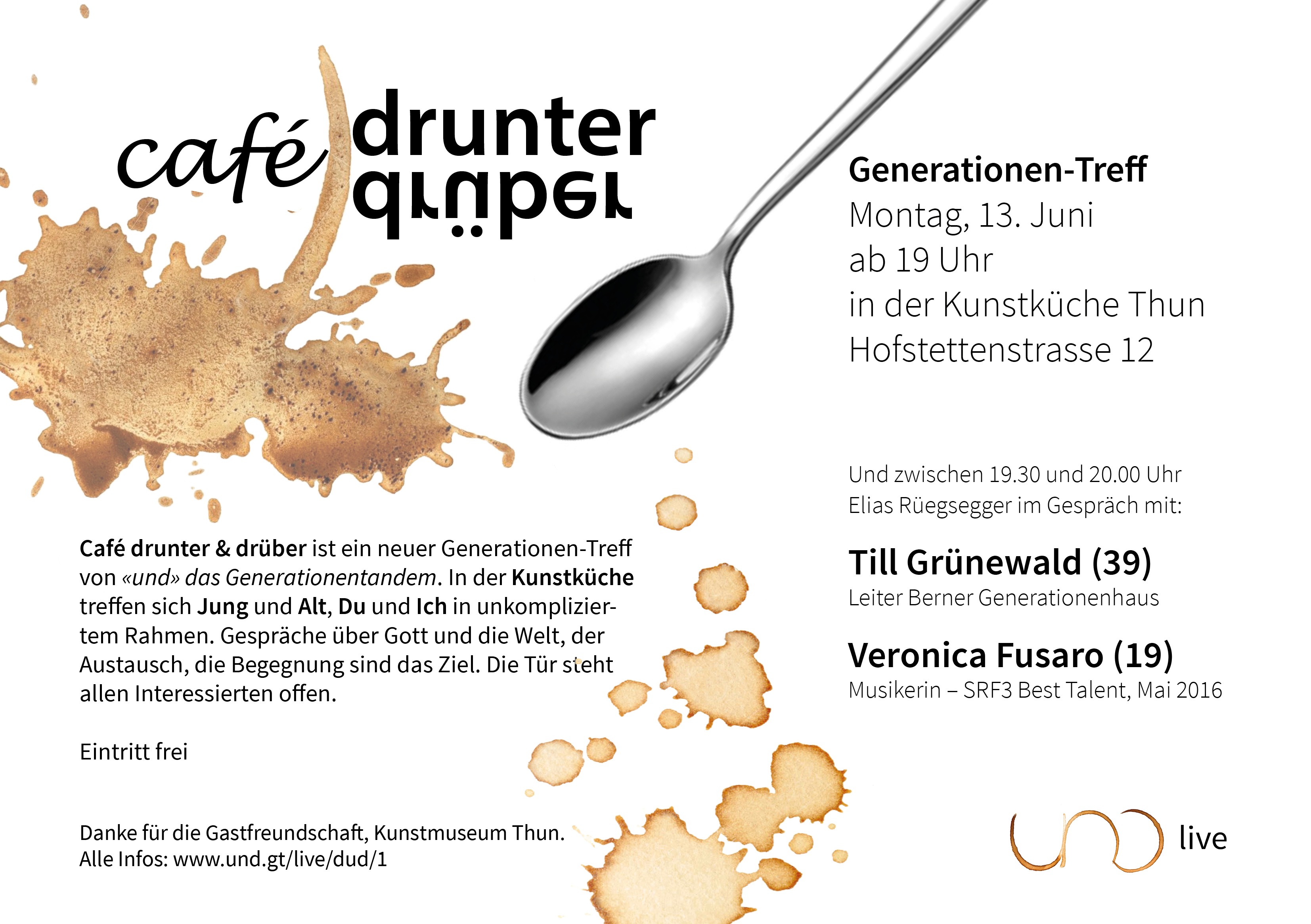 UND Generationentandem lädt zum Café drunter & drüber in der Kunstküche. In der Kunstküche treffen sich Jung und Alt, Du und Ich in unkompliziertem Rahmen. Gespräche über Gott und die Welt, der Austausch, die Begegnung sind das Ziel. Die Tür steht allen Interessierten offen.