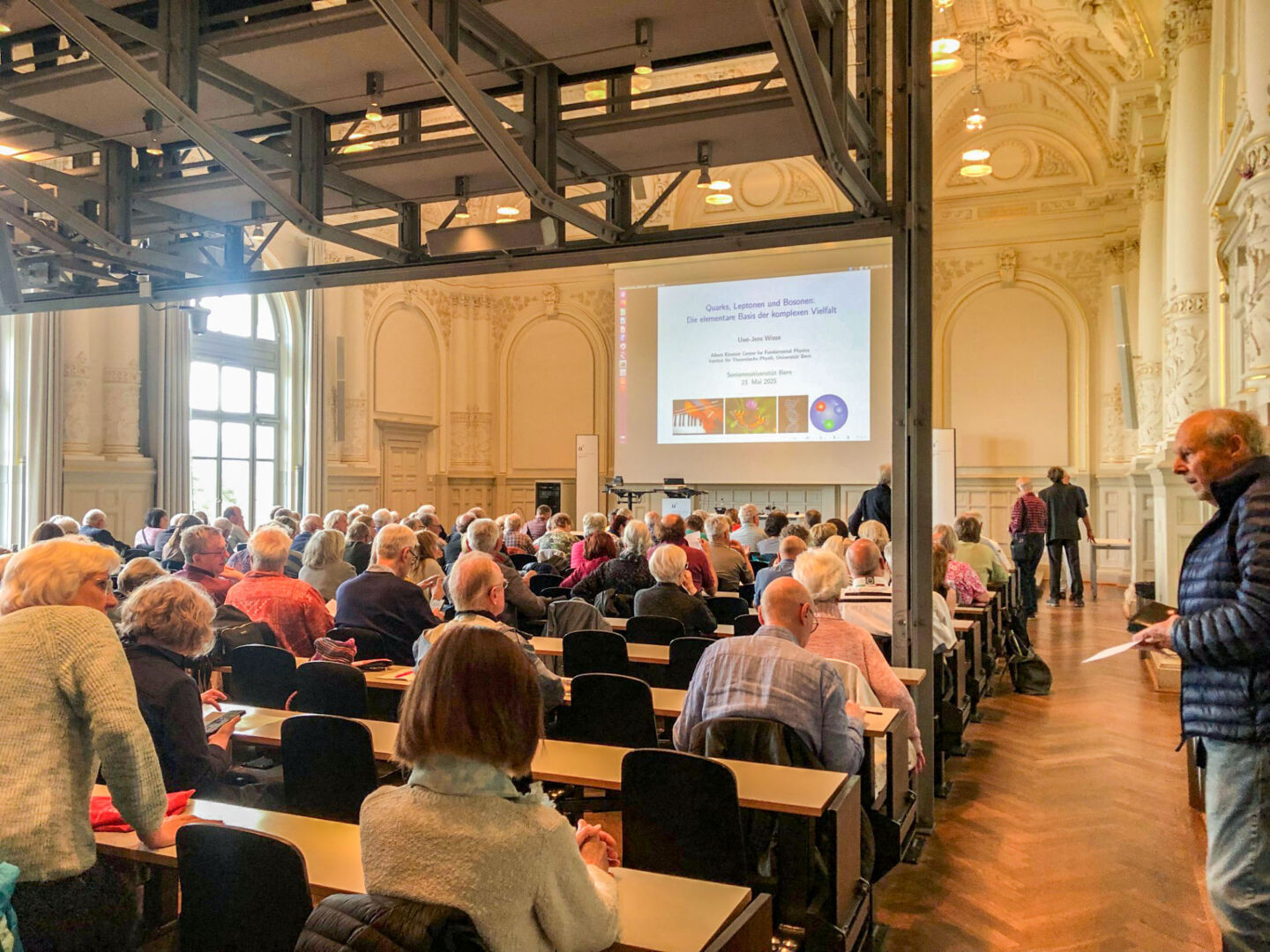 Am Freitagnachmittag wuselt es in der Aula des Hauptgebäudes der Uni Bern. Viele Hörende sind eingetroffen, um einem Vortrag über Elementarteilchen – Quarks, Leptonen und Bosonen – beizuwohnen. Doch sind die Hörenden keine jungen Studierenden. Der Vortrag ist nämlich eine Veranstaltung der Seniorenuniversität Bern.