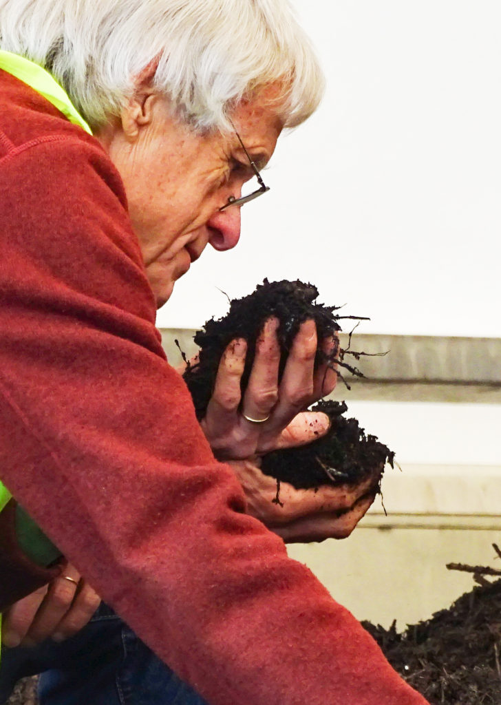 Hansruedi Käppeli lässt sich überzeugen: «Reifer Kompost, riecht gut!» – Bild: Walter Winkler