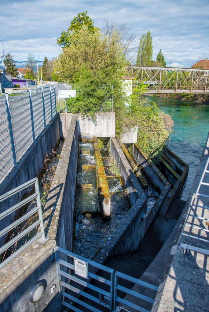 In der Aare bei Thun befinden sich zwei Wasserkraftwerke unterhalb des Schwäbis: Das eine mit einer quer durch den Fluss reichenden Staumauer, es trägt den Namen «AAREwerk 62», weil es 1962 gebaut wurde; das andere liegt etwas seitlich davon, es heisst «AAREwerk 94» und wurde 1994 erbaut. Sie wandeln die in der Wasserströmung der Aare vorhandene Energie über mechanische Turbinen in Strom um. Jährlich erzeugen die beiden Kraftwerke circa 38 Millionen Kilowattstunden Strom, was einem Fünftel des Thuner Strombedarfs entspricht. Was gut ist für uns, ist es aber noch lange nicht für die Fische. Sie können die mehr als sechs Meter hohen Mauern des Wehrs nicht überwinden und damit nicht mehr stromaufwärts wandern. Um weiterhin die Fischwanderung zu ermöglichen, hat der Kanton die Konzession zum Betrieb der Kraftwerke mit der Auflage erteilt, dass eine Fischtreppe gebaut wird.