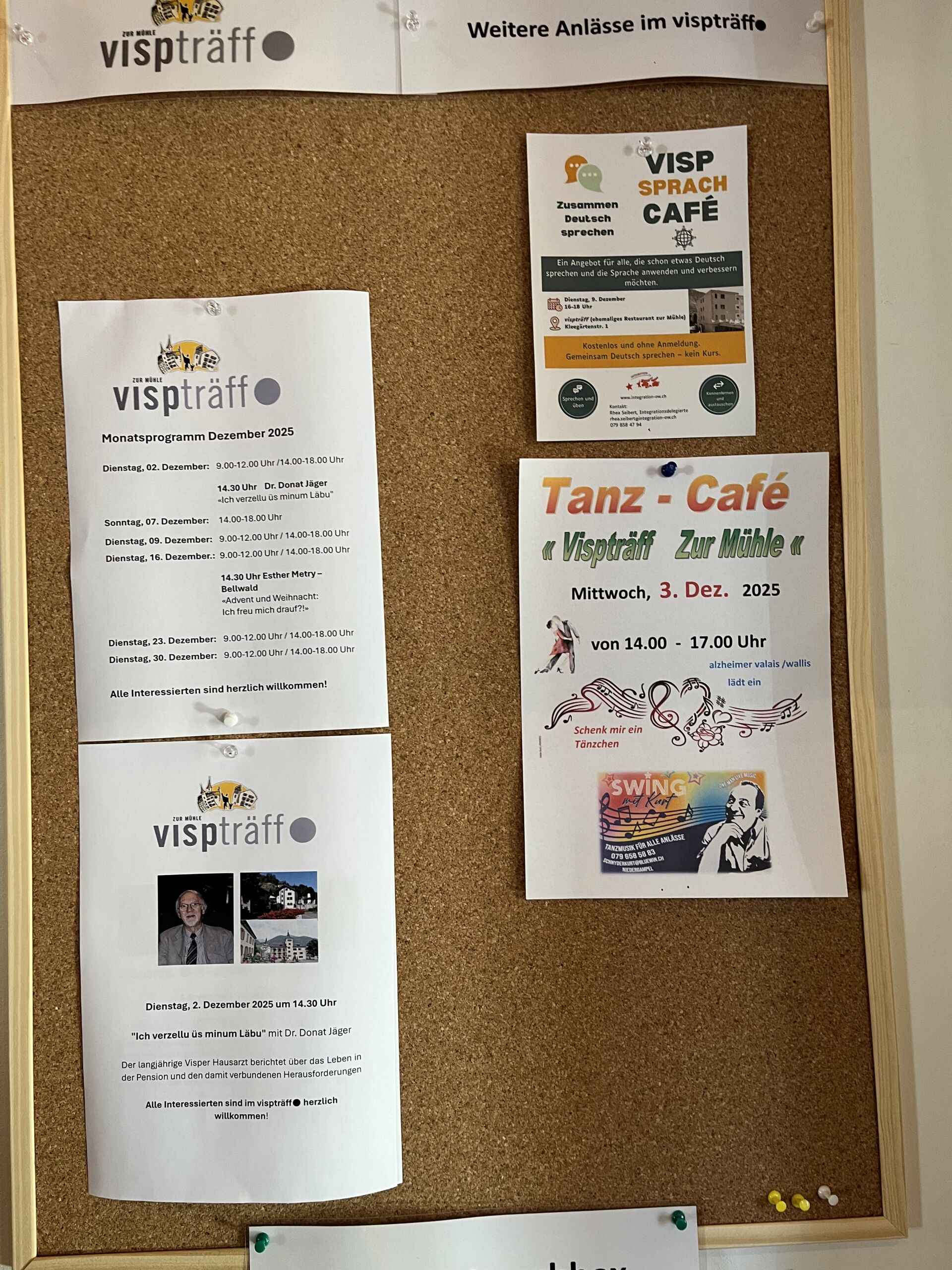 Die Zusammenarbeit mit dem monatlichen «Mittagstisch», mit der «Mütter-Väter-Beratung» und dem «Eltern-Kind-Träff» steht und sogar einzelne Veranstaltungen finden statt; beispielsweise gerade am Nachmittag, da ein alter Hausarzt zu Erinnerungen aus seinem Berufsleben einlädt. Sprachcafé, das Tanzcafé von Alzheimer Valais/Wallis und Gespräche oder Vorträge stehen auf der Agenda.