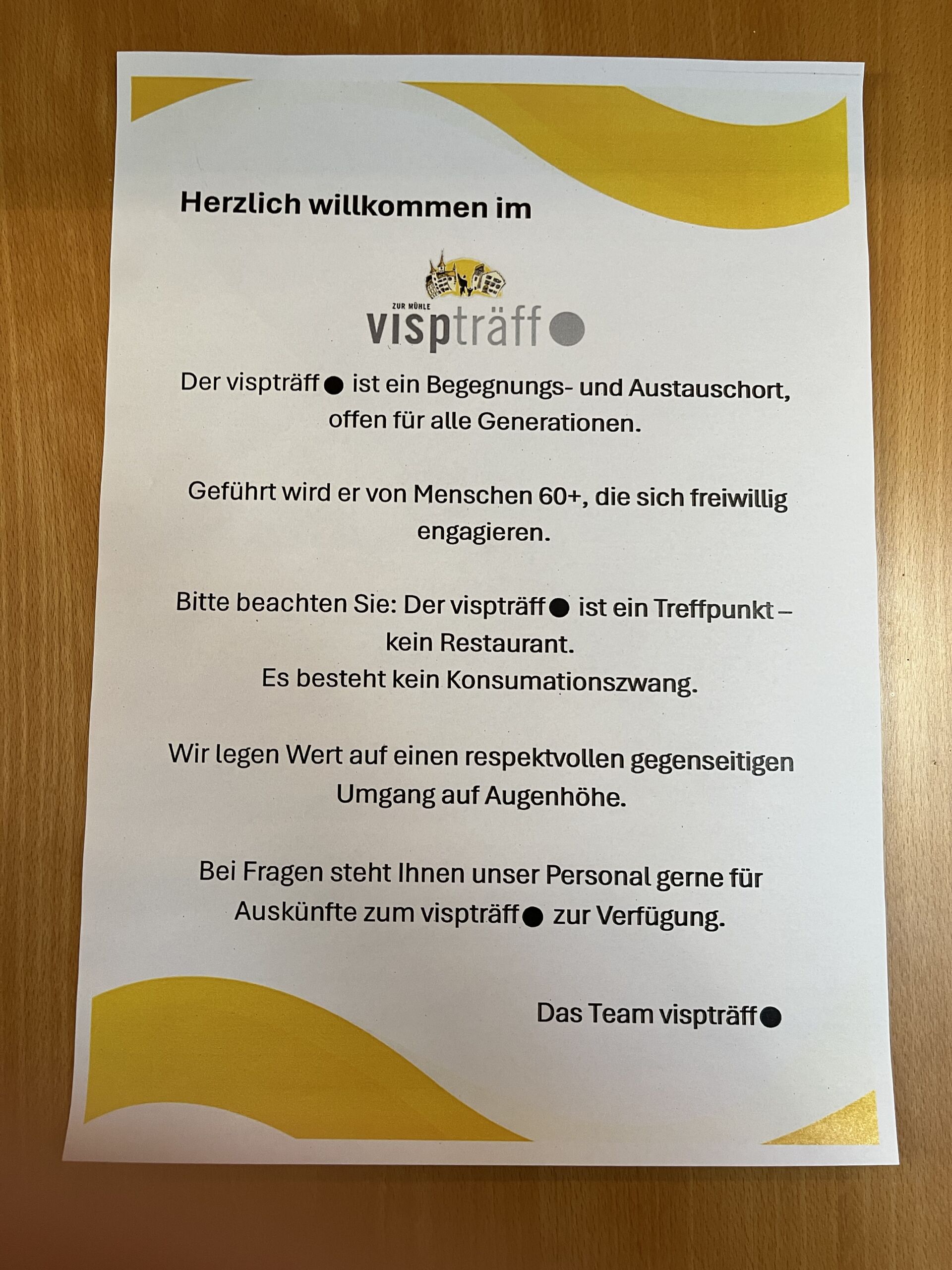 Im Juli 2025 wurde eine Betriebsgruppe gegründet. Darin arbeiten die circa 15 Frauen und Männer über 60, die um den langen Tisch im Säli des Visptreffpunkts sitzen. Sie engagieren sich freiwillig und unentgeltlich und sind für den reibungslosen Ablauf und für die Ausgestaltung verantwortlich. Die Ressorts Gastro, Personal, Programm&Angebotsentwicklung, Finanzen, Kommunikation und Liegenschaft&Technik sind verteilt, die Ideen vorhanden, der Spass daran ebenso.