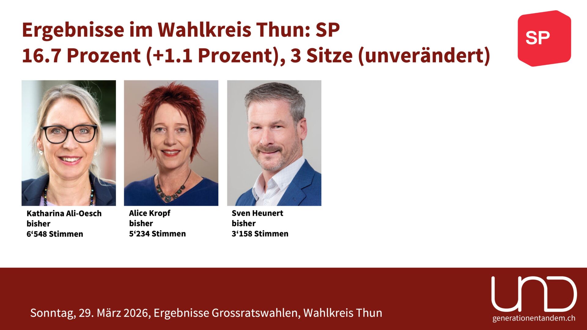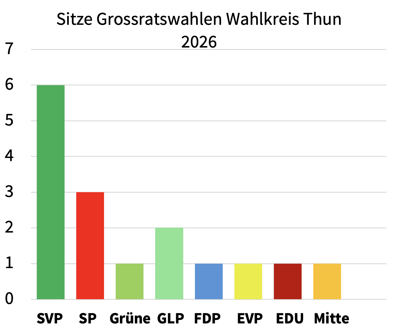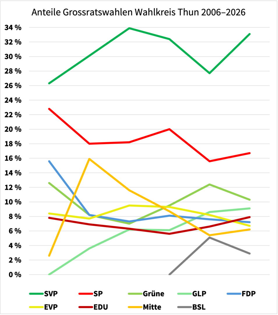 Im Wahlkreis Thun stellten sich 236 Menschen für die 16 verfügbaren Sitze zur Wahl. Am Sonntag, 29. März 2026 konnten die Wahlberechtigten zwischen 17 Listen und 9 verschiedenen Parteien wählen. 15 bisherige Grossrät:innen traten zur Wiederwahl an – nicht alle schafften die Wiederwahl.