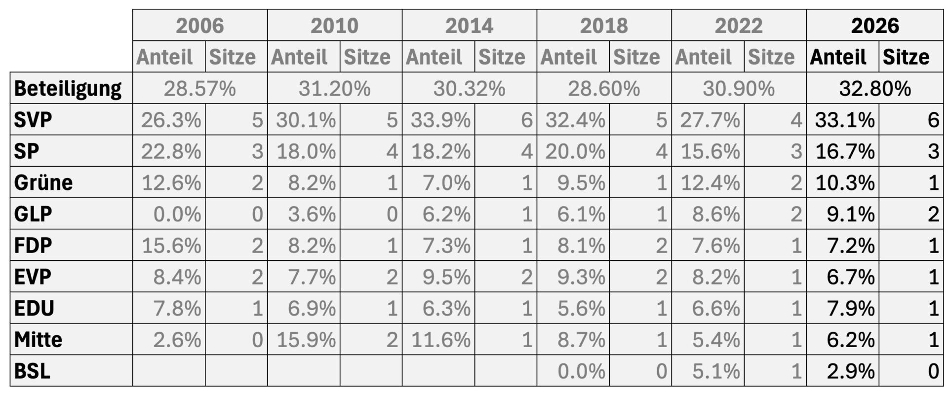 Überraschende Verliererin sind die Grünen. Sie verlieren einen ihrer beiden bisherigen Sitze: Der bisherige Grossrat Thomas Hiltpold ist abgewählt. Obwohl die Grünen mit 10.3 Prozent weiterhin vor der GLP mit 9.1 Prozent liegen, konnte die GLP ihren zweiten Sitz halten. Die GLP gewann 0.5 Prozent und profitierte von der Listenverbindung mit der EVP, EDU, Mitte, FDP, GLP.