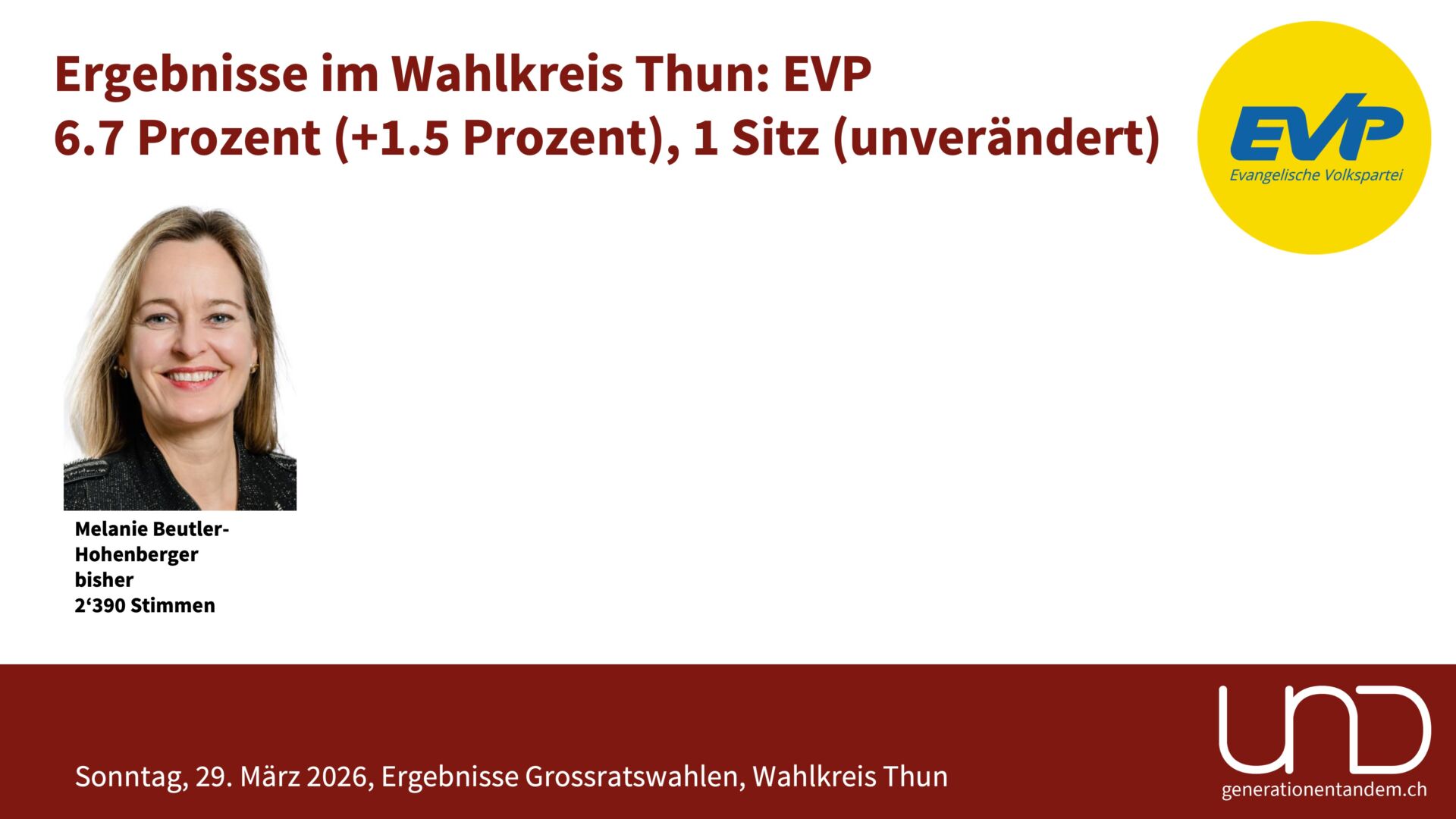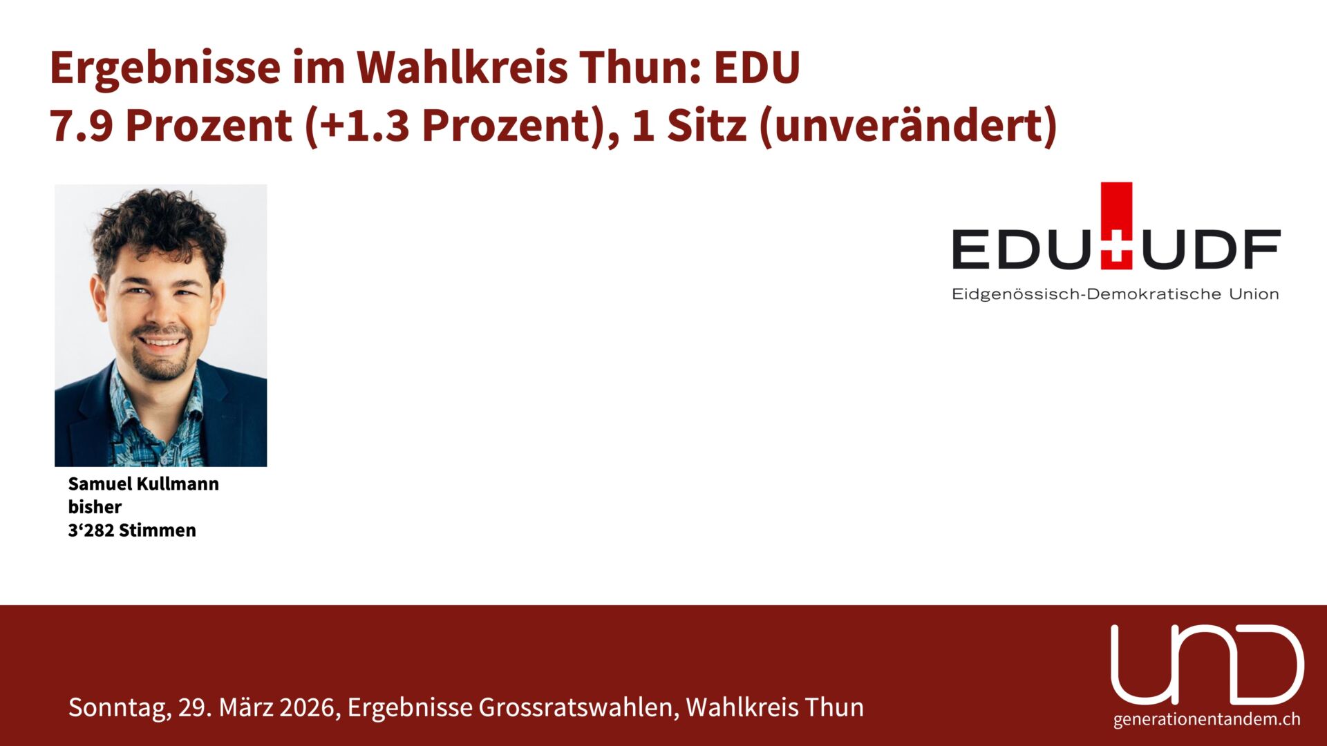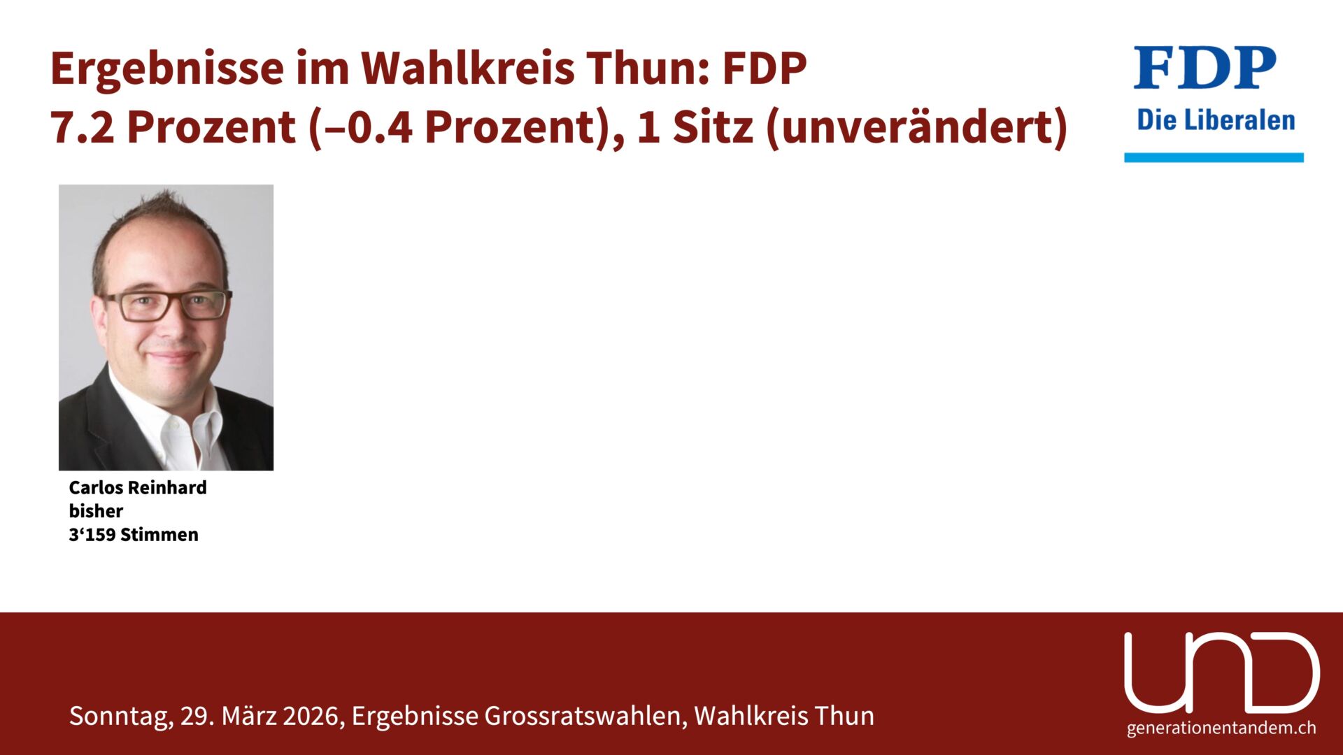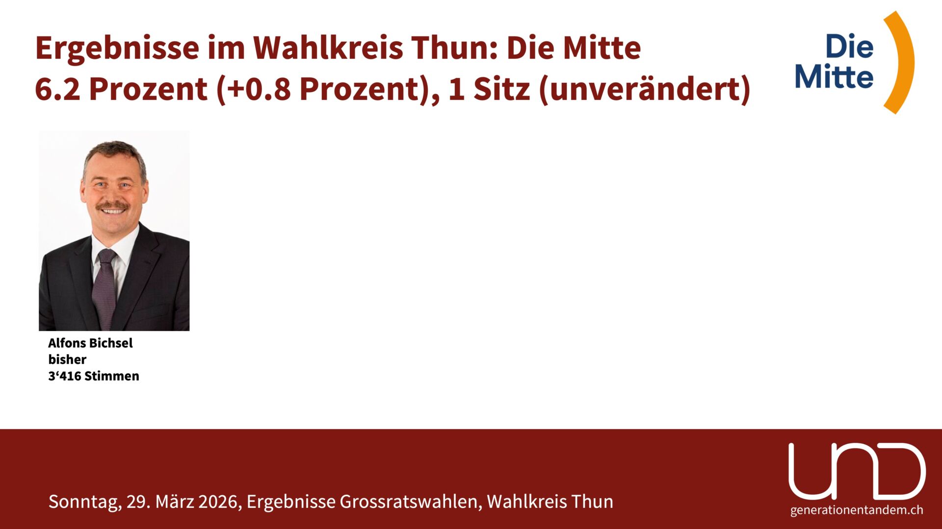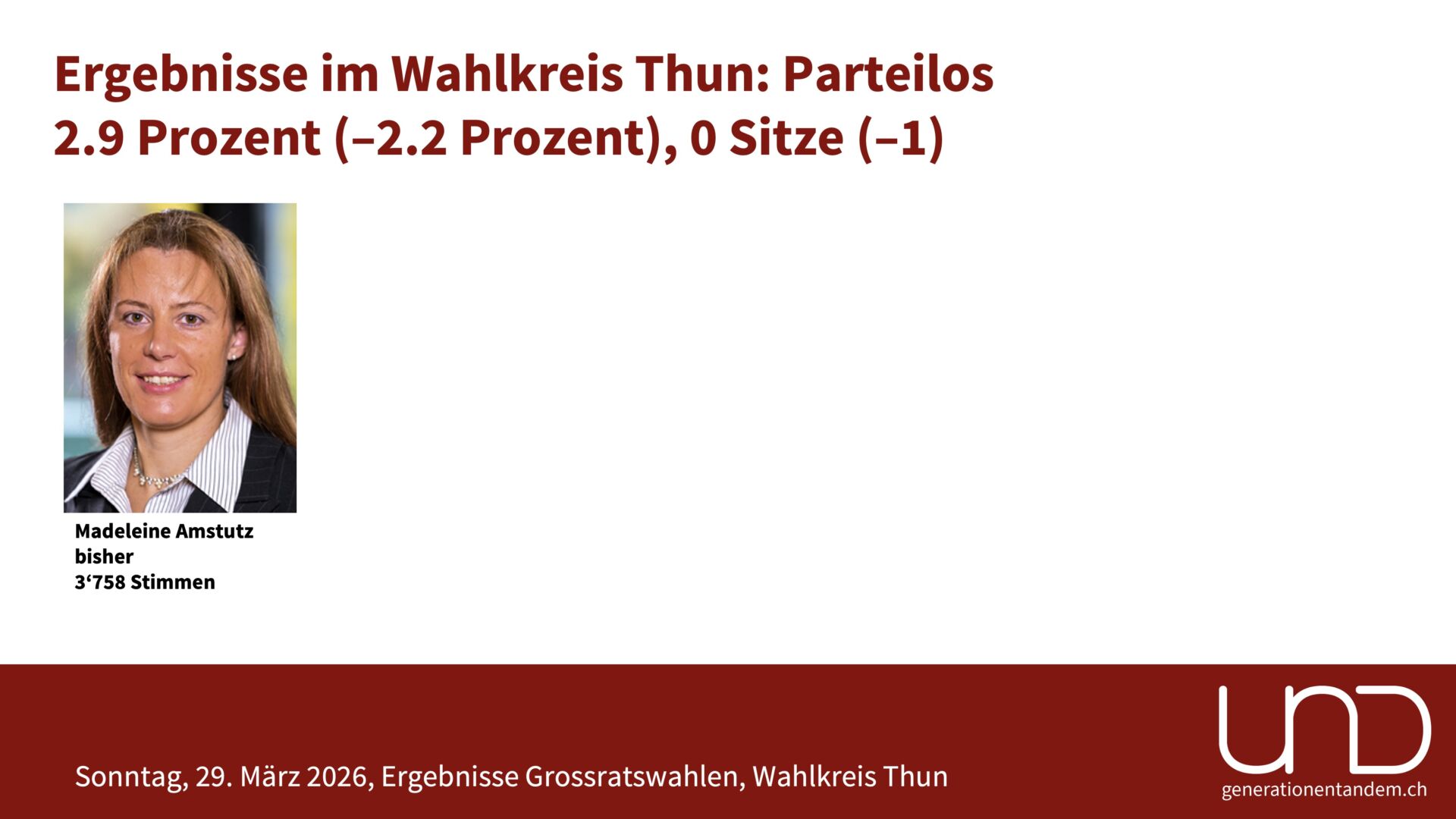 Stimmbeteiligung: Im Wahlkreis Thun gingen 32.8 Prozent der Stimmberechtigten zur Urne. Das sieht nach einer tiefen Beteiligung aus, ist aber tatsächlich leicht mehr als vor vier Jahren und soviel wie nie in den letzten 20 Jahren. Ein Hauptgrund für die tiefe Wahlbeteiligung ist, dass die kantonalen Wahlen jeweils unabhängig von einem eidgenössischen Abstimmungstermin stattfinden.