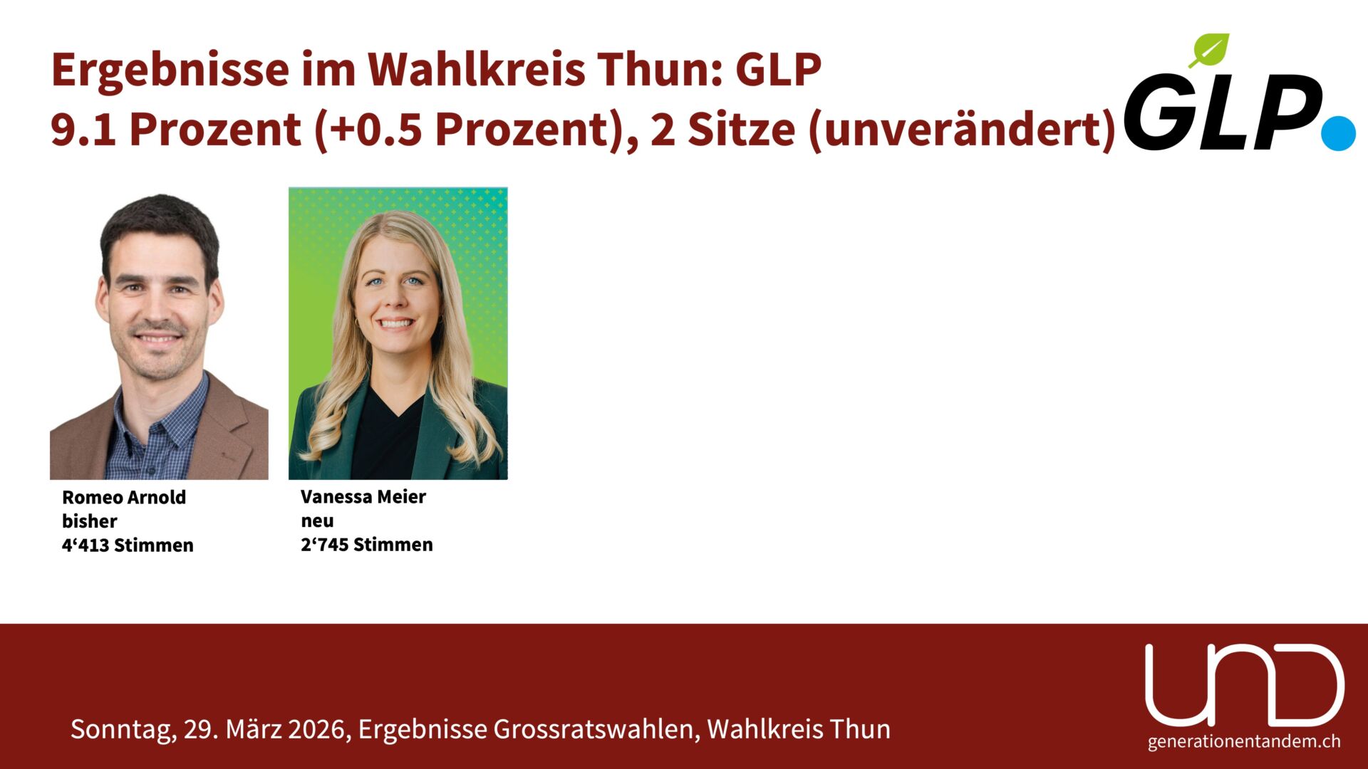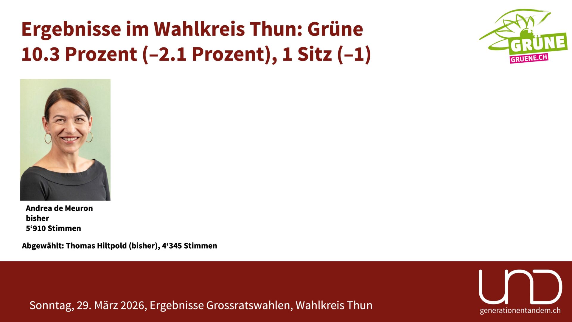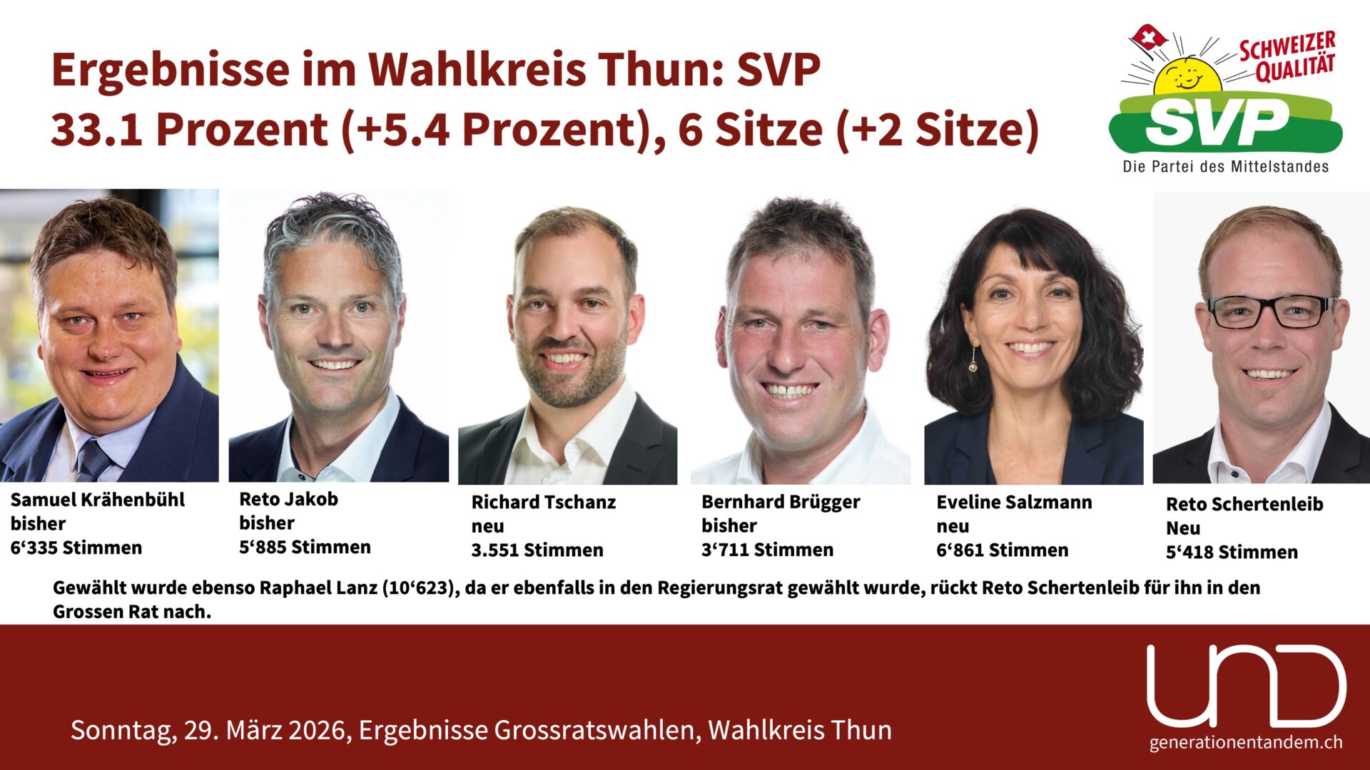 Der Kanton Bern hat gewählt: Im Wahlkreis Thun kommt es zu einigen Verschiebungen. Die SVP gewinnt zwei Sitze, die Grünen und die Parteilosen verlieren je einen Sitz. Die Übersicht von UND Generationentandem zu den Ergebnissen der Grossratswahlen und den Gewählten und Abgewählten.