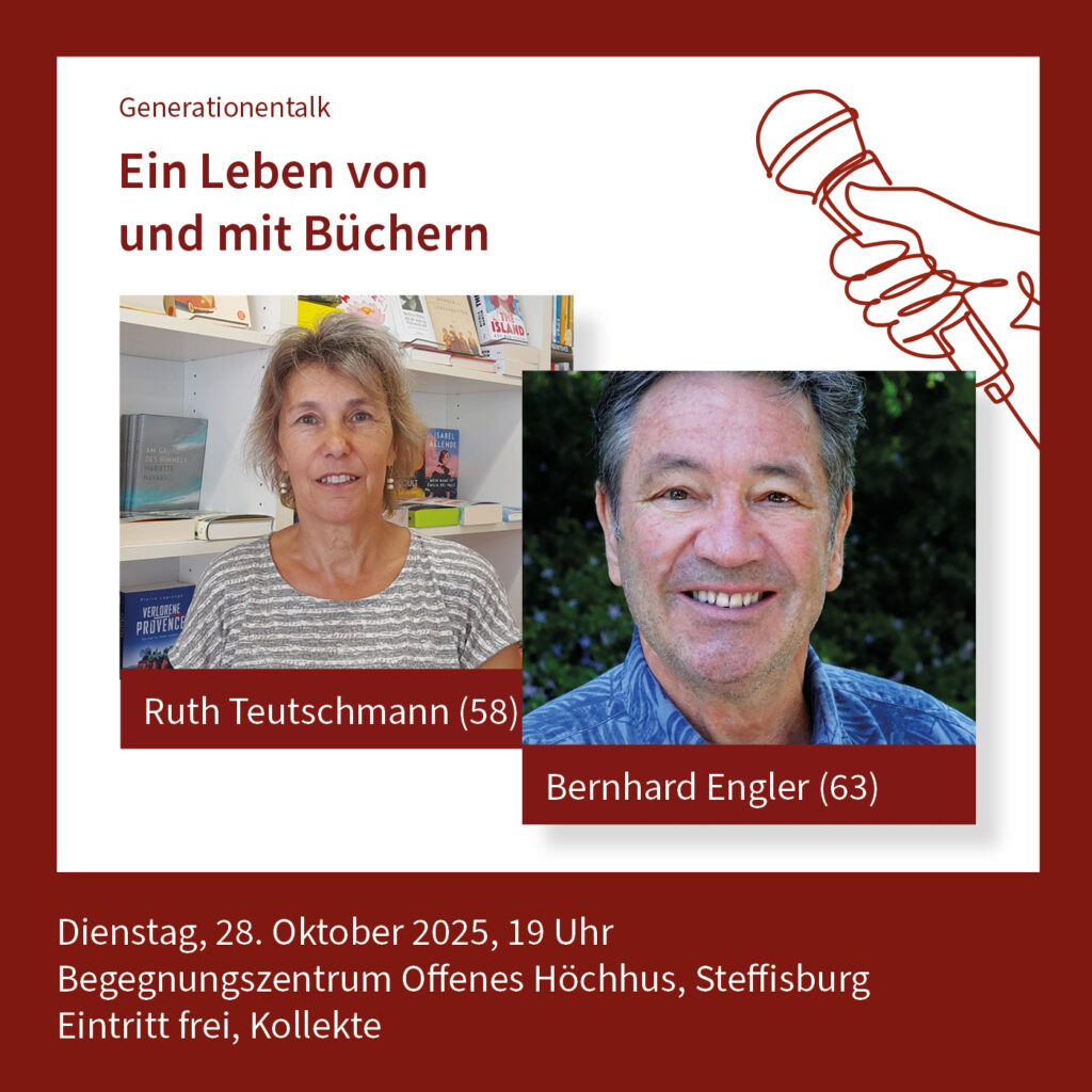 Heidi Bühler begrüsst am Dienstag, 28. Oktober um 19 Uhr im Dachstock des Höchhus Ruth Teutschmann (58) und Bernhard Engler (63) zum Gespräch über die Welt der Bücher und die Arbeit damit. Hier im Livestream mitzuverfolgen oder vor Ort.
