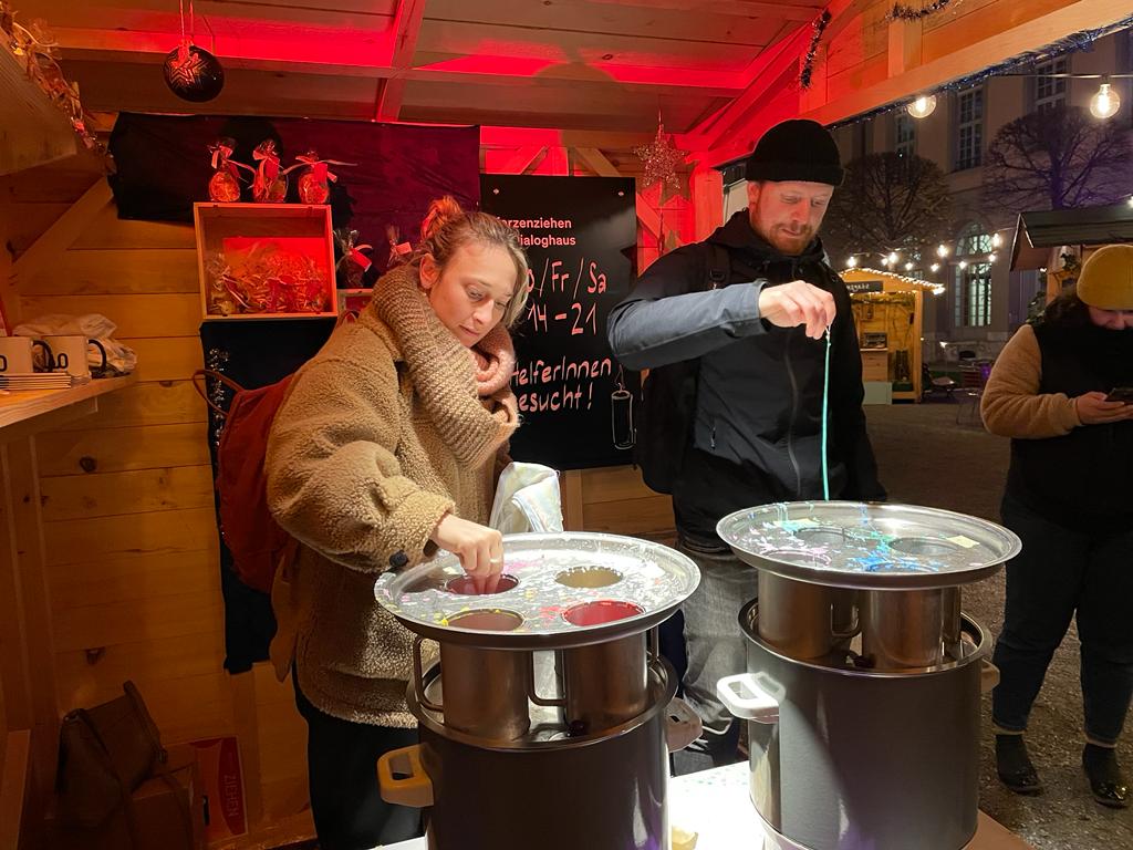 Nach dem letztjährigen erfolgreichen Start mit Kerzenziehen im Innenhof des Berner Generationenhaus, ist UND Generationentandem sehr gerne wieder Teil des Winterprogramms 2022. Ja, der Verein legte gleich zu und brachte das Angebot auch auf den Weihnachtsmarkt in Thun. Im Schutz der Holzhäuschen können sich Klein und Gross um die warmen Töpfe stellen, miteinander scherzen und erzählen und beobachten, wie die eingetunkten Dochte Schicht um Schicht zulegen. Eine gute Idee für Einzelpersonen, Familien- oder Kindergruppen und gleichzeitig eine erweiterte, behagliche und rundum gelungene Winterausgabe des gelben Zuhörbänkli.
